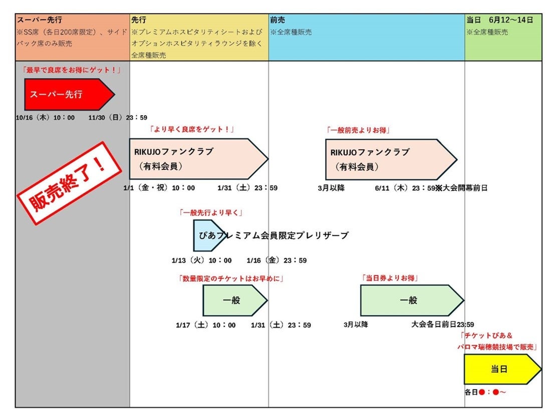 ・現時点では競技時間が未定ですので、恐れ入りますがご了承の上でお申し込みください。ご来場時間に制限のある方は競技時間が決定した後に受付をする別の販売をご利用ください。