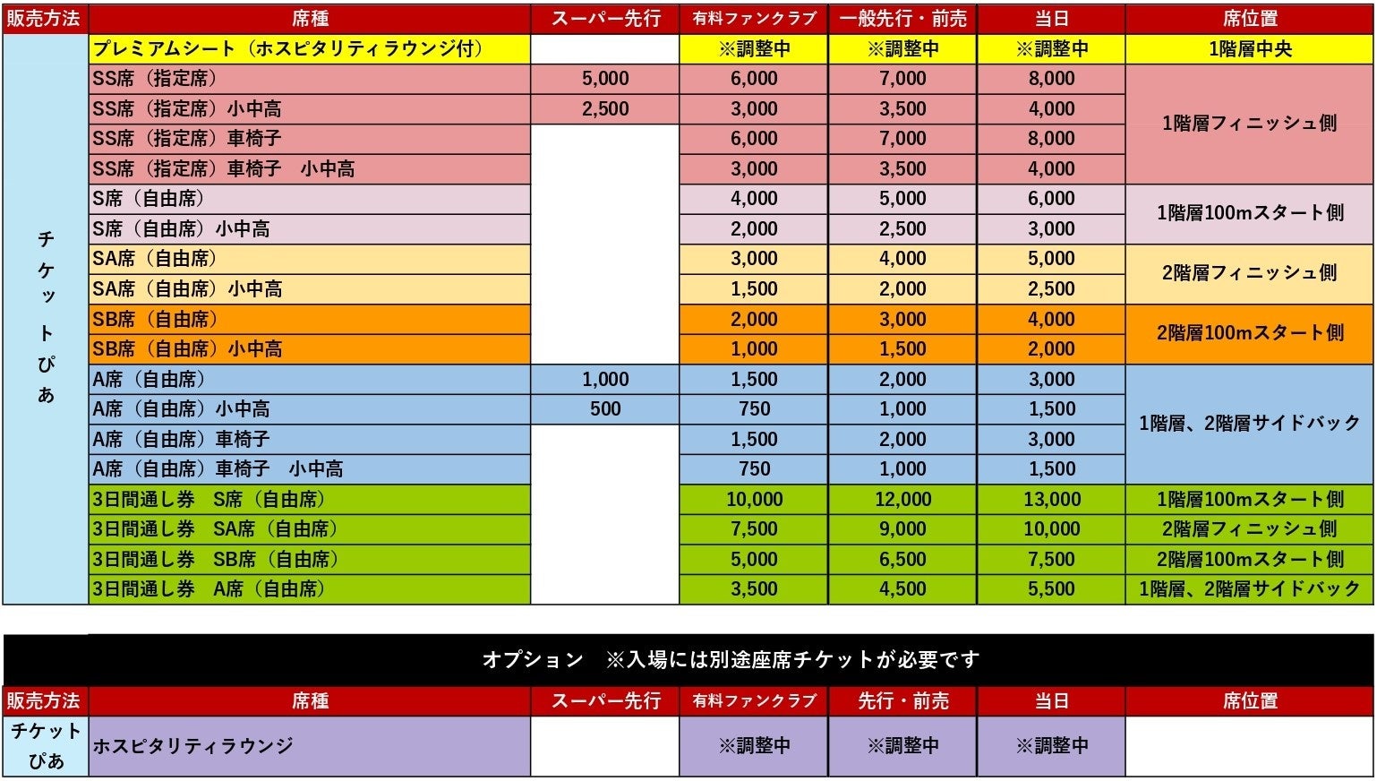 ※プレミアムシート、<オプション>ホスピタリティラウンジチケットは3月以降に販売を予定しております。