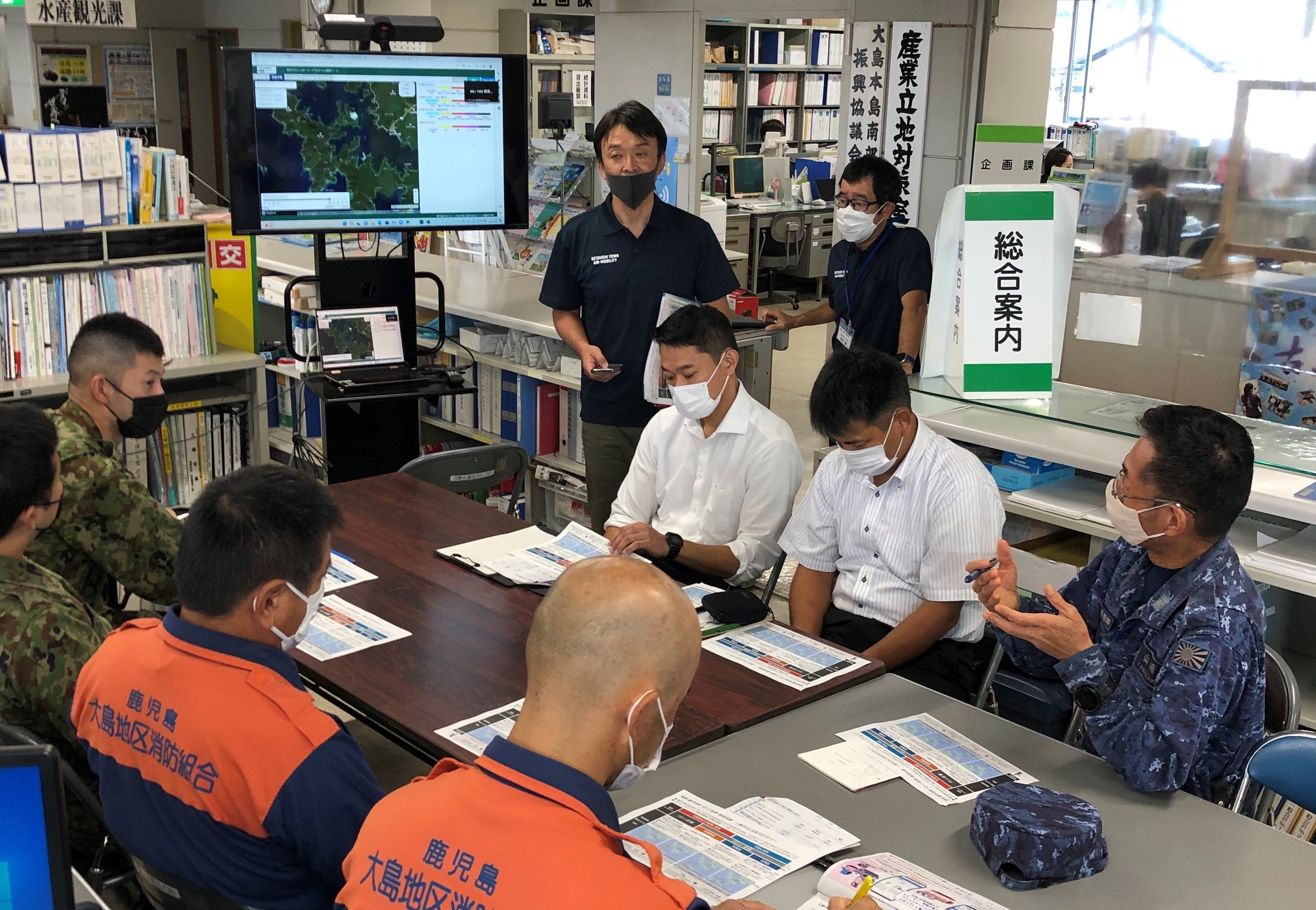瀬戸内町町役場に設置した災害対策本部には自衛隊/消防/警察にもご参加いただき、撮影用ドローンの飛行位置や高解像な撮影画像を関係者で確認するとともに、専用スマートフォンアプリを通じて集まる住民からの被災情報や救援物資の要請などをすべて一元的に集約してダッシュボートとして表示し、ドローンとICTの組み合わせにより、迅速な被災状況の把握、対策協議・判断に活用しました。