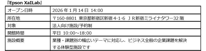 エプソン販売株式会社は、法人のお客様向け・予約制のソリューションセンターとして新たに『Epson XaILab(エプソンサイラボ)』を2026年1月14日にJR新宿ミライナタワー内に開設します。本施設では、体験と対話を通じてお客様の課題解決を支援し、新たな価値の創出を目指します。