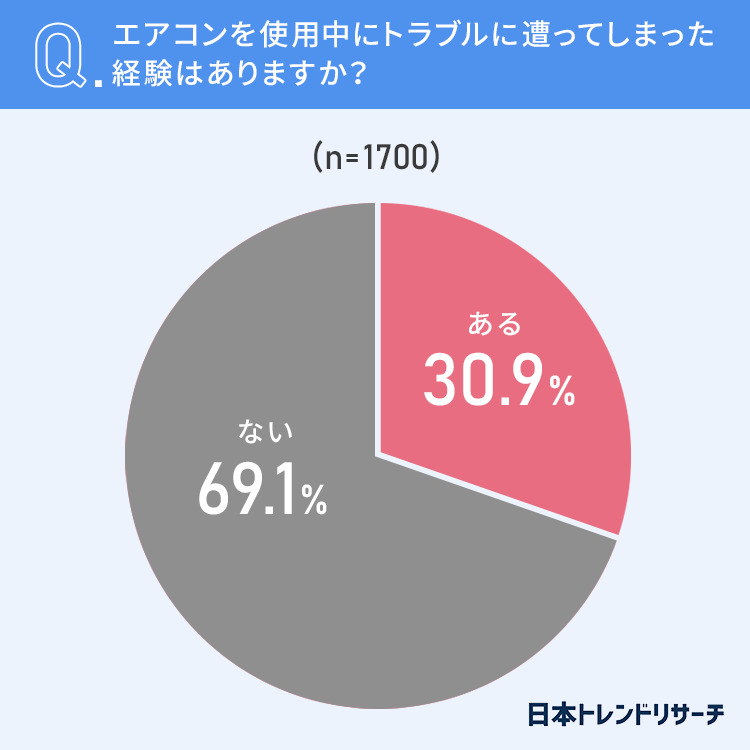 エアコンを自宅で使用している方のうち30.9%が、エアコンを使用時にトラブルに遭ったことが「ある」と回答しました。