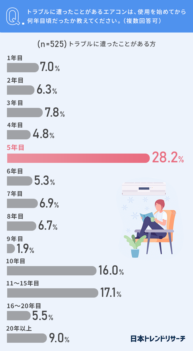 トラブルに遭った時のエアコン使用年数では「5年目」が28.2%ともっとも多く、初めて何かしらのトラブルが起きやすい時期のようです。