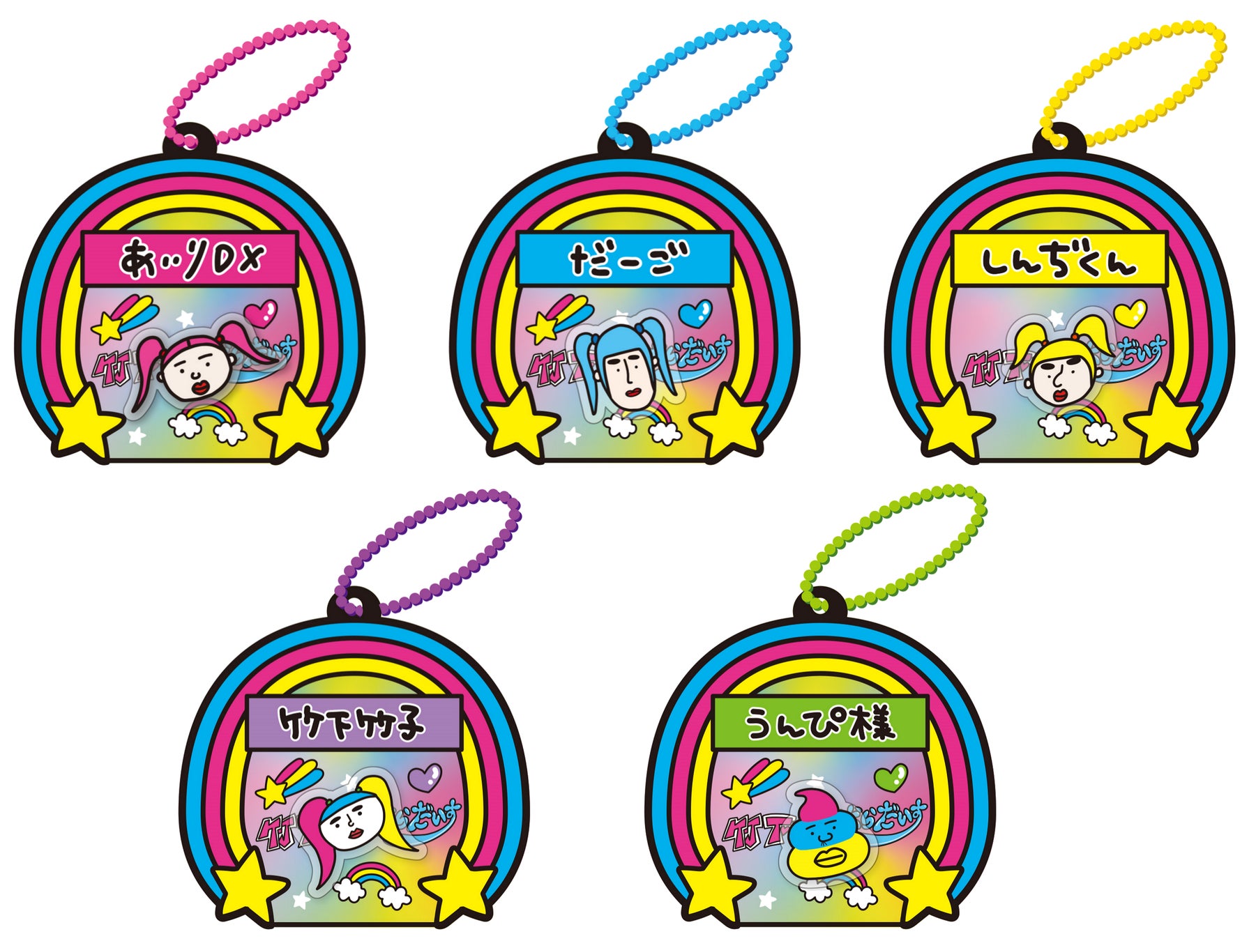 あぃりDX、だーご、しんぢくん、竹下竹子、うんぴ様のラバーマスコット。