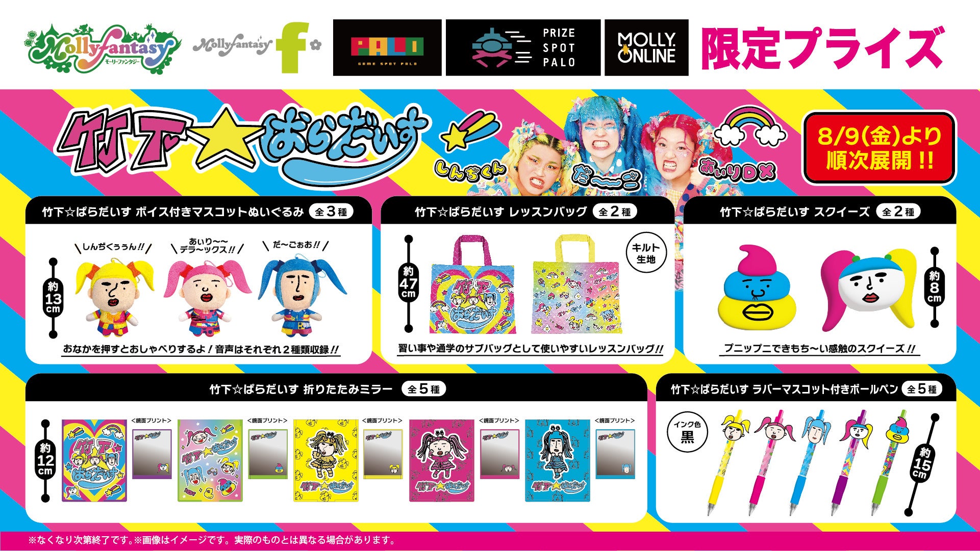株式会社イオンファンタジー(本社:千葉県千葉市、代表取締役社長:藤原徳也、以下、当社)は、“オモロカワイイ”を発信する原宿クリエイターアイドル「竹下☆ぱらだいす」の当社限定プライズゲーム用景品5アイテムと当社限定カプセルトイ2アイテムを「モーリーファンタジー」「PALO」をはじめとするアミューズメント施設、オンラインクレーンゲーム「モーリーオンライン」等において8月9日(金)より順次展開いたします。