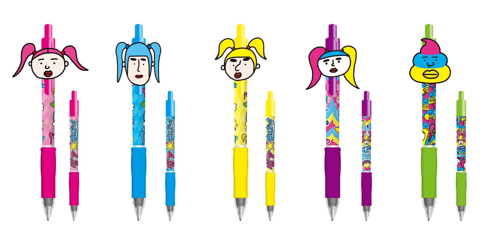 あぃりDX、だーご、しんぢくん、竹下竹子、うんぴ様のフェイスデザインのラバーマスコットが付いたボールペン。