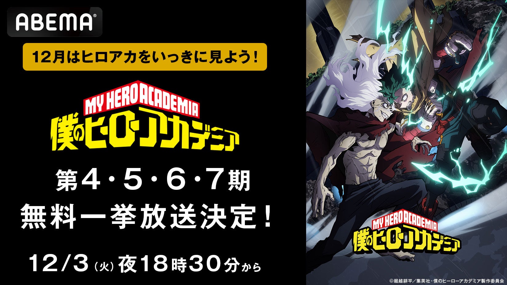 新しい未来のテレビ「ABEMA」は、大人気アニメ『僕のヒーローアカデミア』の第4期から最新第7期を、2024年12月3日(火)より順次、全話無料一挙放送いたします。