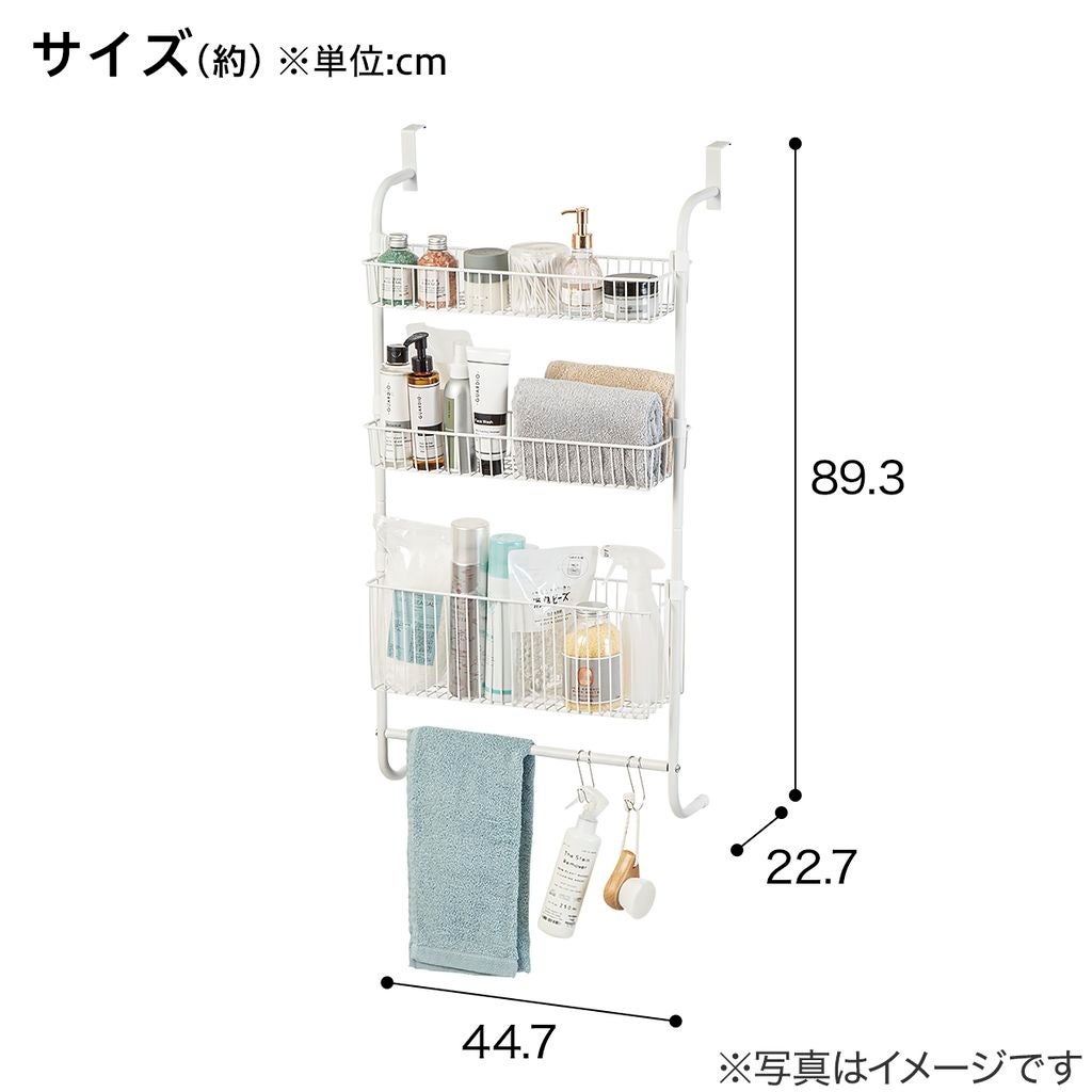 ドアかけ収納は3種類あり、3段タイプは高さ約89cmとコンパクトで最下部のバーに使用頻度が多い小物やタオルを引っ掛けることができます。