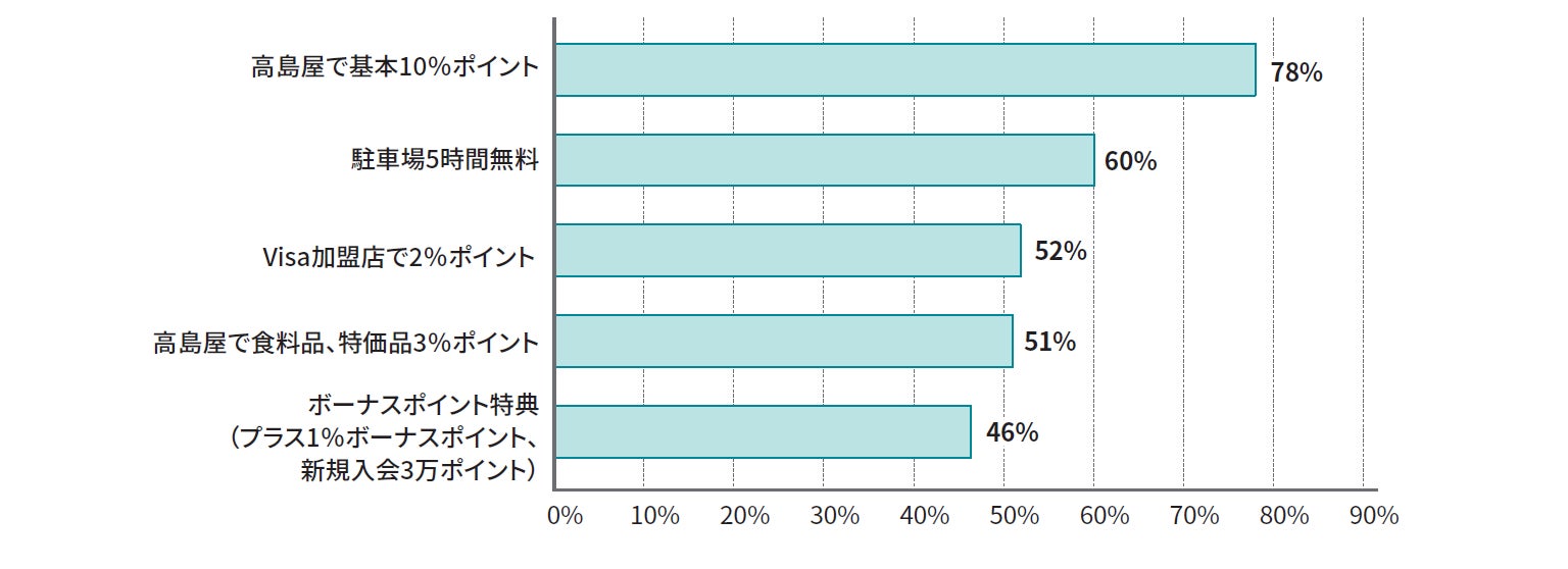 本カード会員さまが満足しているサービスを具体的に質問したところ、「高島屋で基本10%ポイント」、「高島屋で食料品、特価品3%ポイント」の高島屋店内での高還元のほか、「Visa加盟店で2%ポイント」や高島屋含む国内Visa加盟店でプラス1%のポイントが付与される「ボーナスポイント」といったポイント関連の回答がTOP5の大半を占める結果に。また「駐車場5時間無料」は2位と高評価でした。