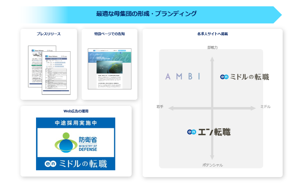 プレスリリースや特設ページ、Web広告での告知に加え、各求人サイトでの集客支援を行ないます。『エン転職』『AMBI』『ミドルの転職』とターゲットの異なる3つの求人サイトを活用することで、ターゲットへ網羅的に求人を届けます。