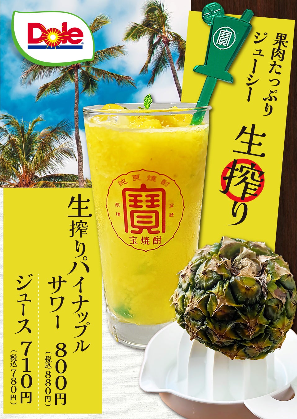 「Dole」×『串かつとお酒 でんがな』生パイナップルをたっぷり半分使用したコラボドリンクが初登場!「生搾りパイナップルサワー」「生搾りパイナップルジュース」