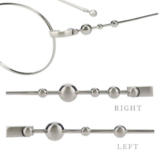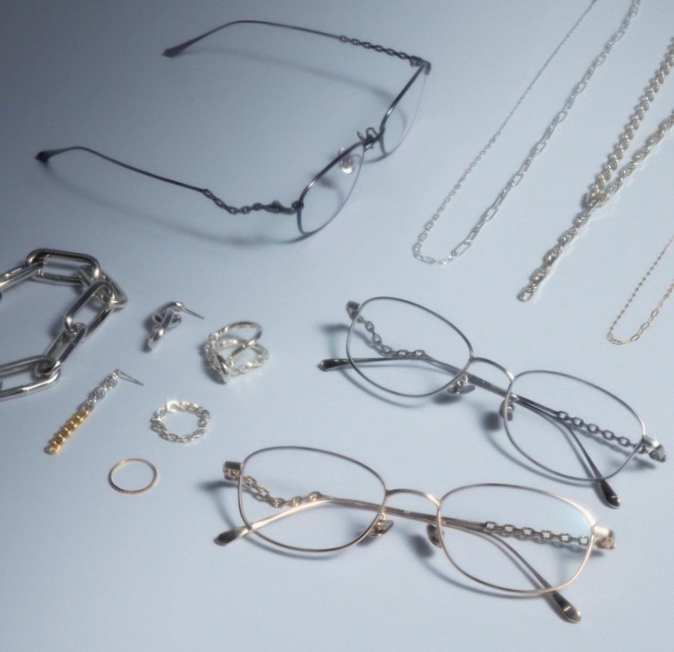 テンプルの片側だけがたゆむアシンメトリーのチェーンデザイン。品よく着崩したファッションのように、どこか一部力の抜けたシルエットは、エフォートレスかつ上級者なムードを感じるモデルです。※テンプルのチェーンは固定されており、揺れなどの動きは起こりません。
