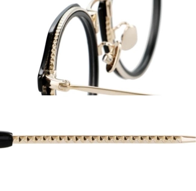 ダイヤモンドの底部、普段は見えない部分を指す「キューレット」をスタッズで表現。エッジの効いたピラミッドシェイプのモチーフが、レンズの縁やテンプル部分に整列し、横顔をクールに彩ります。
