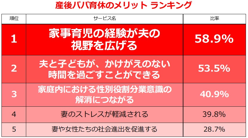 | 1.産後パパ育休がスタートすることを「知らなかった」64.6% 2.産後パパ育休のメリット「家事育児の経験が夫の視野を広げる」58.9% /産後パパ育休のメリット ランキング 3.産後パパ育休のデメリット「却って妻のストレスが溜まる」49.8% /産後パパ育休のデメリット ランキング 4.フリーコメントより |