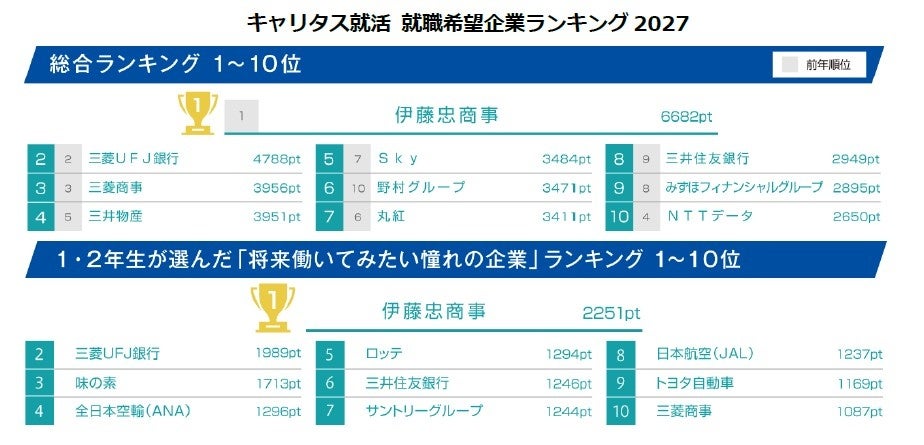 キャリタス就活・CFN 就職希望企業ランキング調査結果 ~国内1位は伊藤忠商事、海外大生1位は三菱商事~
