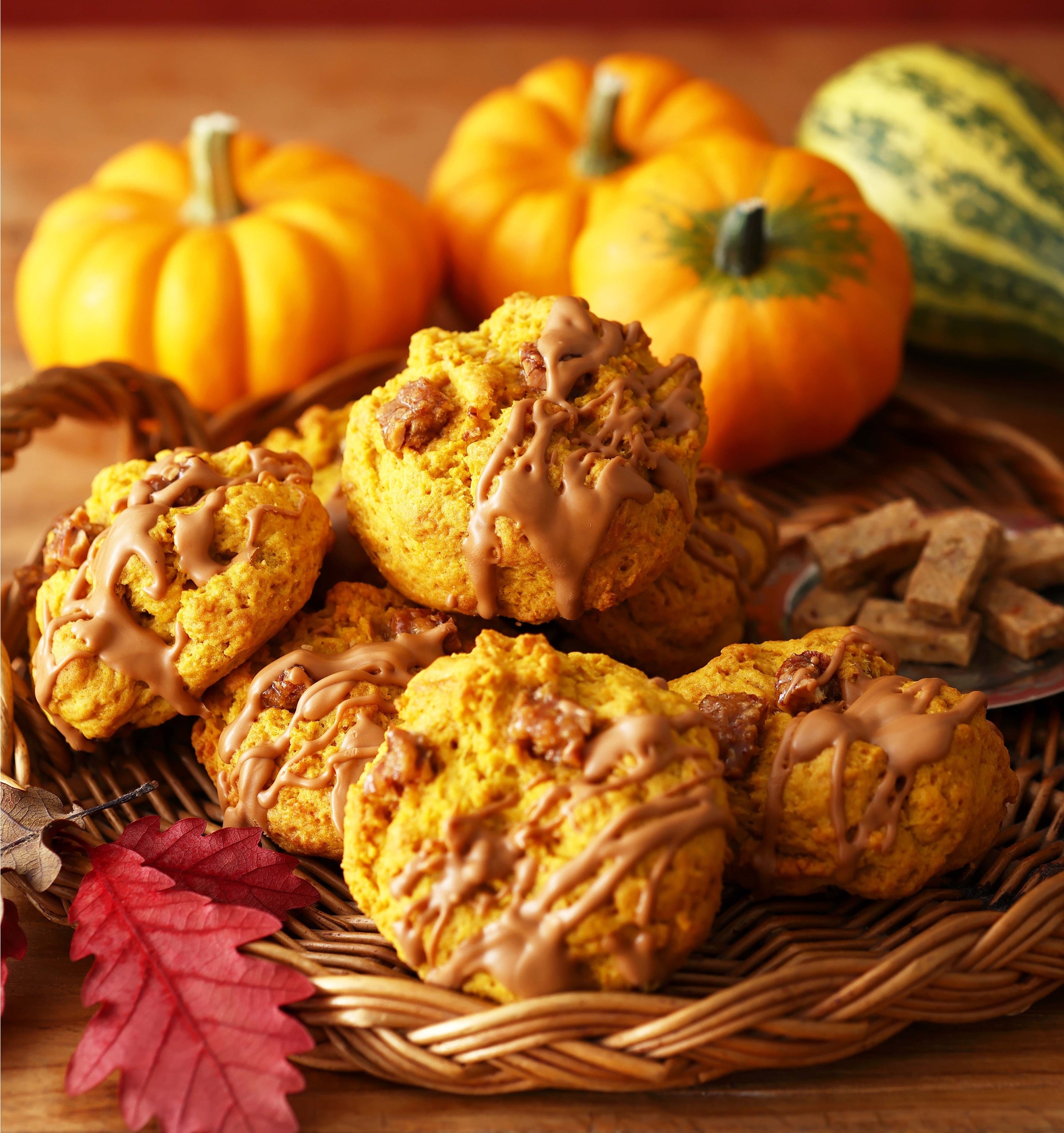 パンプキンシナモンスコーンにサクサクとした食感の香ばしいアーモンドスカッチを加えて焼き上げ、キャラメルチョコレートをトッピングしました。※オンラインストアではセット販売です。