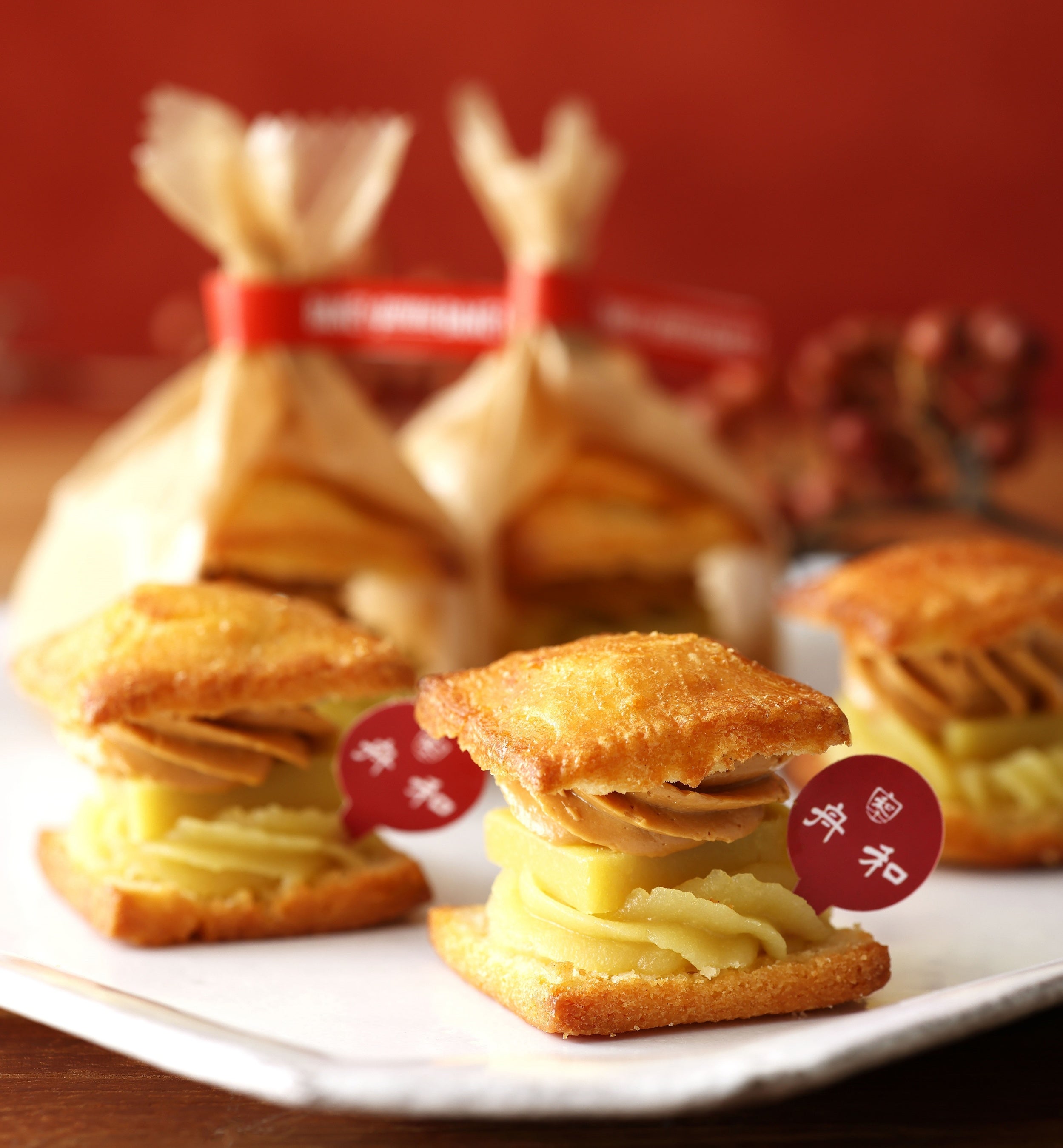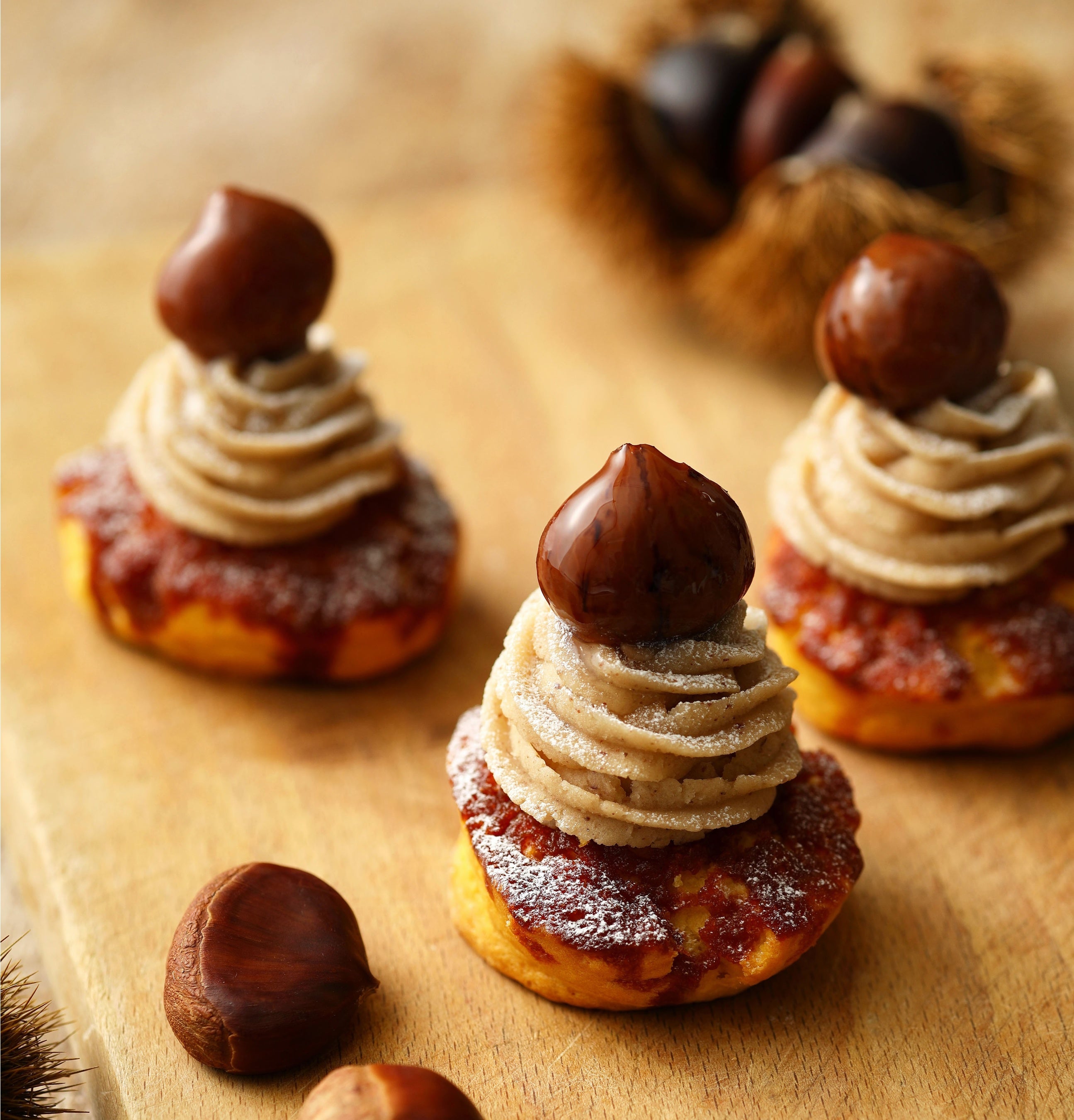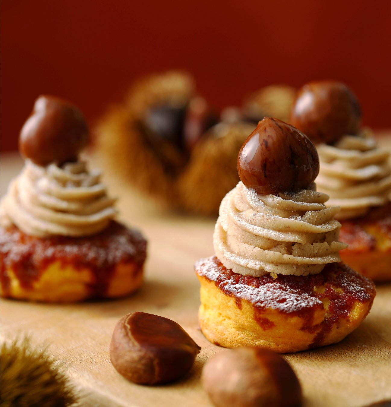 カリッとしたカラメルの食感が特徴のカスタードプリン味のスコーンに、風味豊かな渋皮栗餡をモンブラン仕立てに絞り、渋皮栗をまるごと一粒のせました。※オンラインストアではセット販売です。デコレーションが異なります。