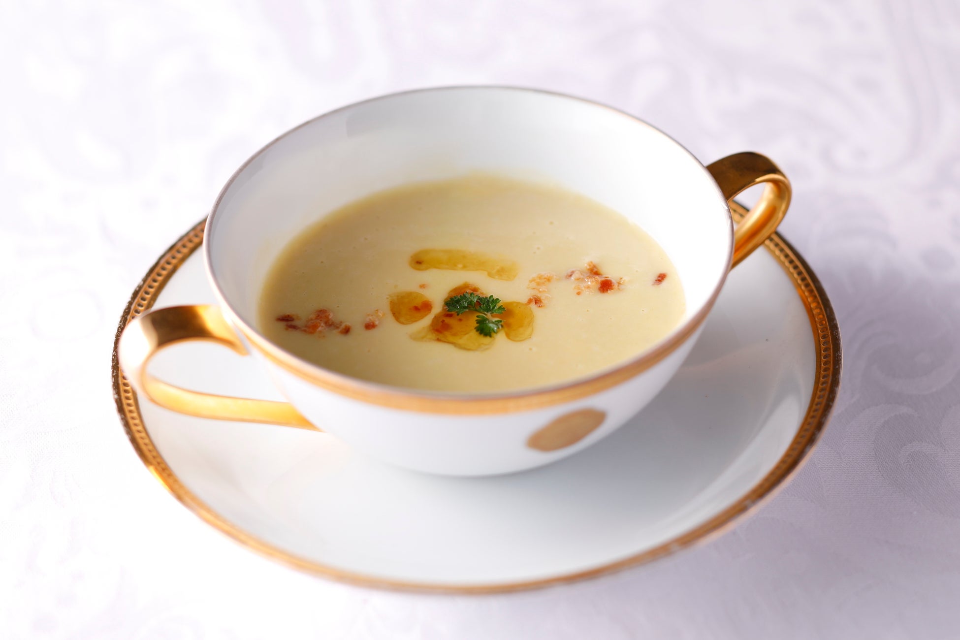 濃厚なクリュスタッセのジュと新玉葱のクリームスープ 宮崎県産キャビア添え(+¥500)