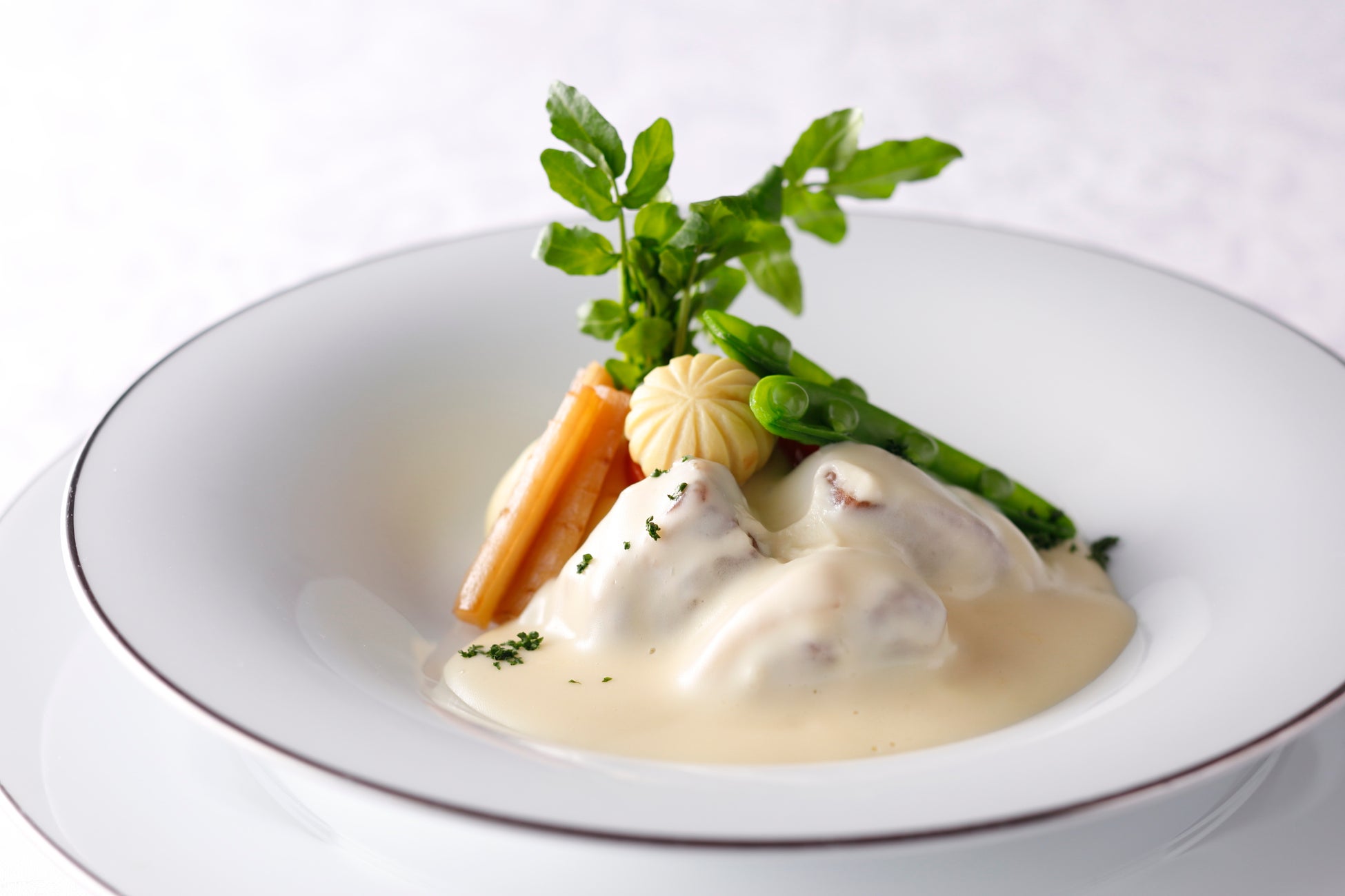 魚料理は駿河湾の“天竜金目鯛”にあごだしで炊いた“合馬たけのこ”のごはんを添えています。肉料理はホワイトソースでイベリコ豚の肩ロース肉を柔らかく煮込んだフリカッセをご用意しました。