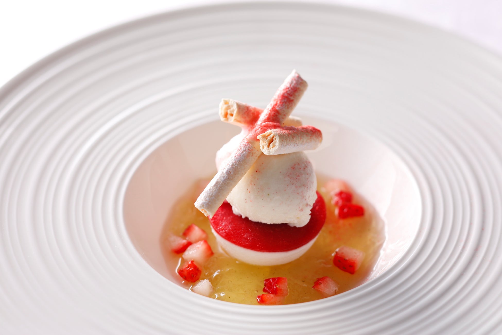 他にもグリーンとホワイトの二色のアスパラガス“さぬきのめざめ”をボイルとソテーで仕上げた前菜や、春野菜ならではの甘みが感じられる春キャベツのポタージュ、クラフトティーと苺の香りと味わいが楽しめるデザートなど、コースを通して春の味覚を堪能いただけます。この機会にぜひお召し上がりください。