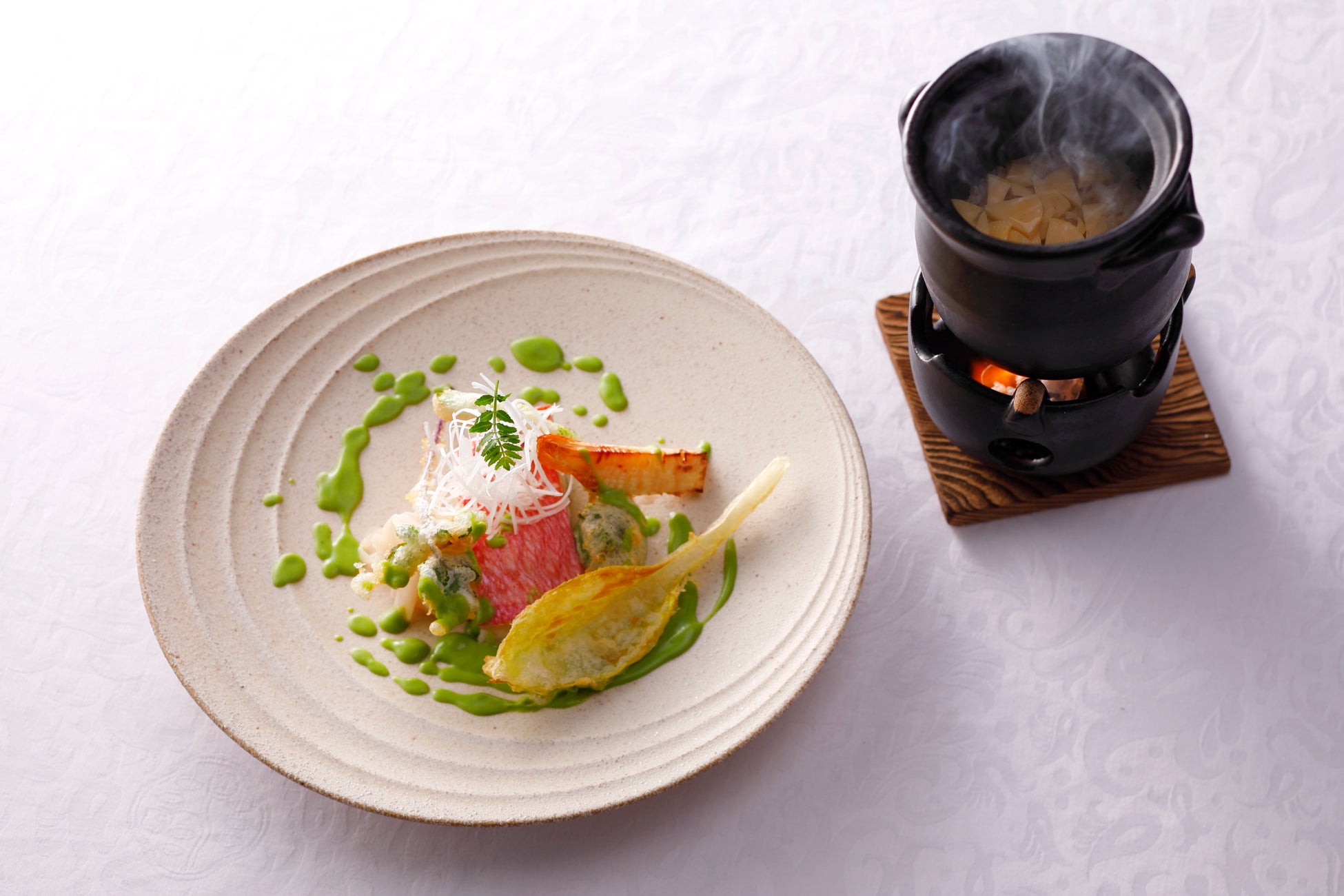 静岡県産 “天竜金目鯛”のポシェ 小さなご飯釜で炊き上げた“合馬たけのこ”のピラフ
