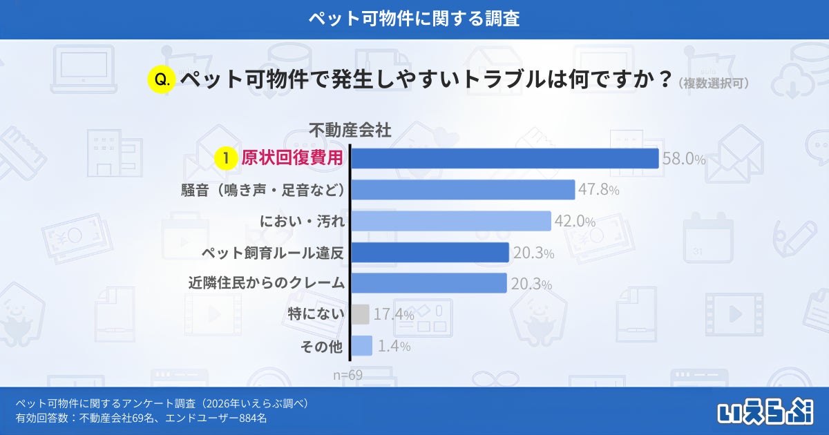 一方、不動産会社に「ペット可物件で発生しやすいトラブルは何ですか?」と質問したところ、「原状回復費用」が58.0%と最も多い回答となりました。これは、退去時の修繕費用を負担・調整する立場にある不動産会社ならではの課題といえます。