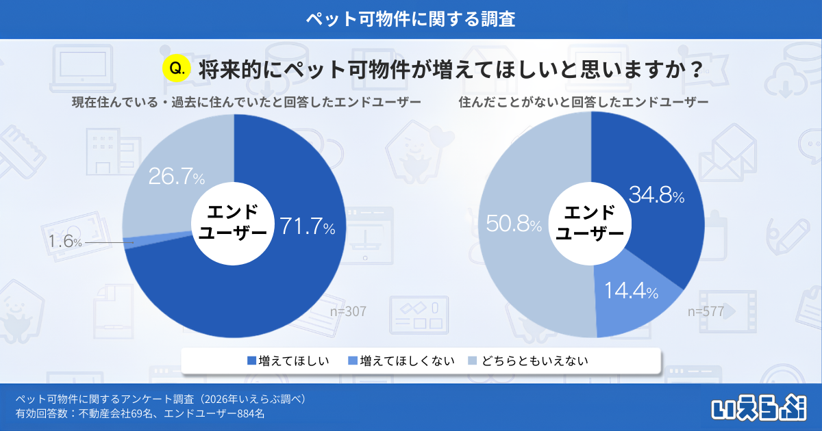 一方、ペット可物件に住んだことがないエンドユーザー(※4)の回答としては、「増えてほしい」は34.8%にとどまり、「増えてほしくない」が14.4%、「どちらともいえない」が50.8%という結果となりました。