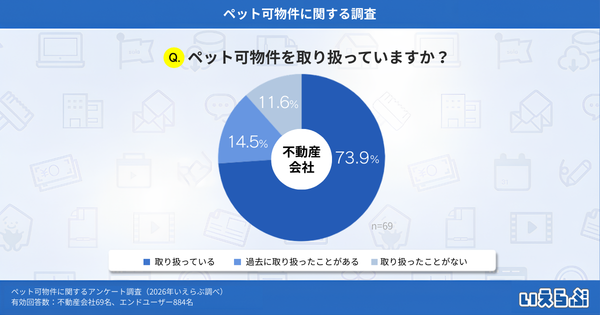 不動産会社に「ペット可物件を取り扱っていますか?」と質問したところ、「取り扱っている」(73.9%)、「過去に取り扱ったことがある」(14.5%)、「取り扱ったことがない」(11.6%)という結果となりました。