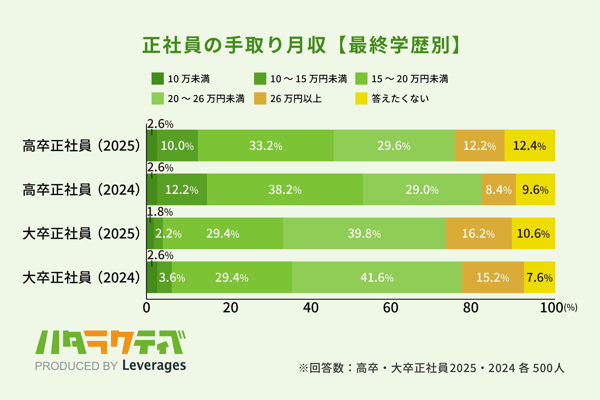 2024年度と2025年度の手取り月収を比較すると、高卒正社員では「20万円以上」と回答した割合が4.4pt上昇したのに対し、大卒正社員は0.8pt減少しました。この結果から、大卒正社員の手取り月収よりも高卒正社員の手取り月収の方が上昇幅が大きいことが分かります。