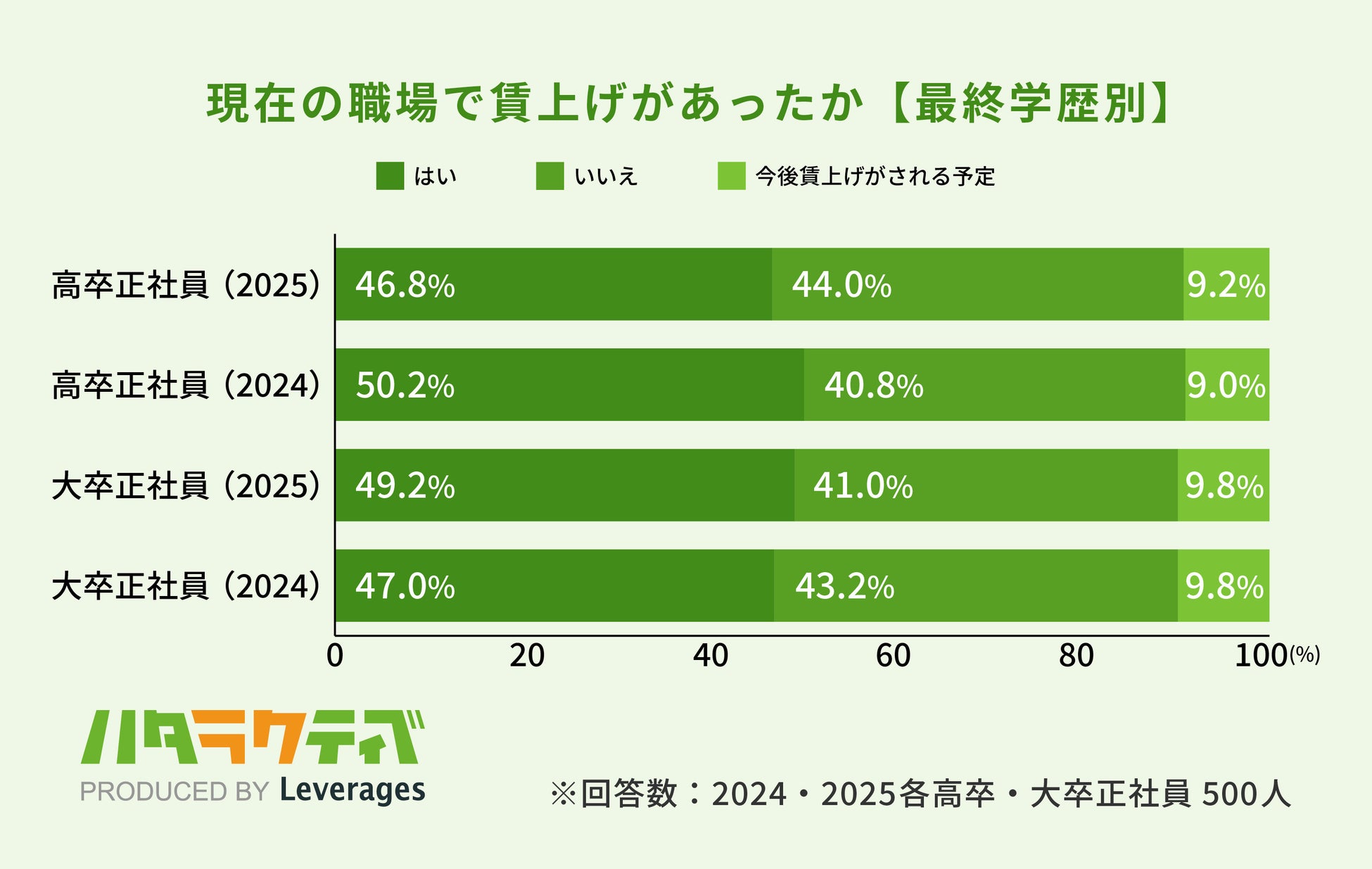 「若者しごと白書※1」における2024年と2025年の比較結果から、「賃上げがあった」と回答した割合は、高卒正社員で3.4pt減少した一方、大卒正社員で2.2pt増加していることが明らかとなりました。