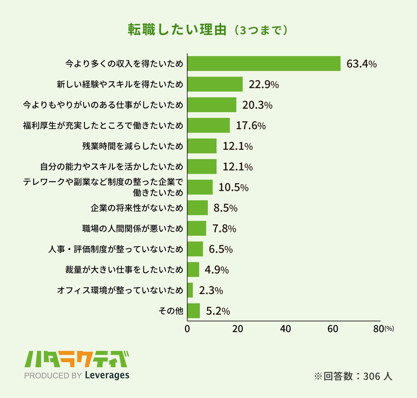 2025年に調査した「若者しごと白書」によると、若手社員が「転職活動を希望する理由」として、「今より多くの収入を得たいため(63.4%)」が圧倒的多数を占め、他の項目を大きく上回る結果となりました。このことから、収入面の向上が転職を検討する際の主要な判断軸になっていることがうかがえます。