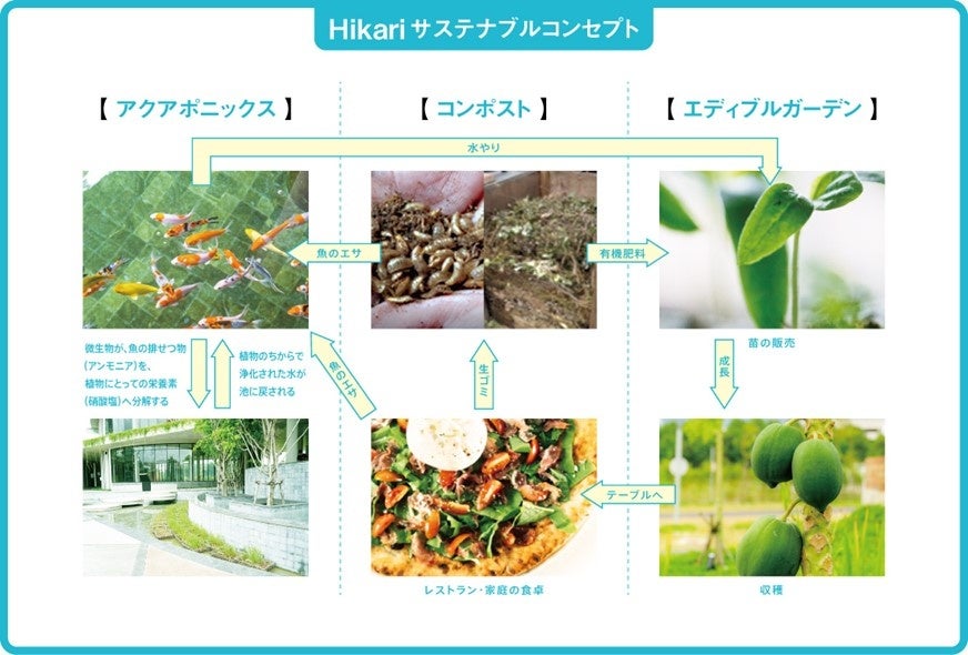 商業施設「Hikari」は、人口約270万人のビンズン省都であるビンズン新都市の中心部・ビンズン省総合庁舎の正面に立地しています。本施設では、ビンズン新都市における持続可能な街づくりを目指して、緑豊かなランドスケープや、アクアポニックス、生ごみのコンポスト、エディブルガーデン(食べられる植栽)、太陽光発電などの環境に配慮した取り組みを導入しています。9月30日には、本施設のコンセプト設計から携わり、同国やカンボジアで現在27店舗を展開する日系イタリアン「Pizza 4P’s」の旗艦店が開業し、ゼロウェイストをコンセプトにした同国初の環境配慮型レストランを目指します。