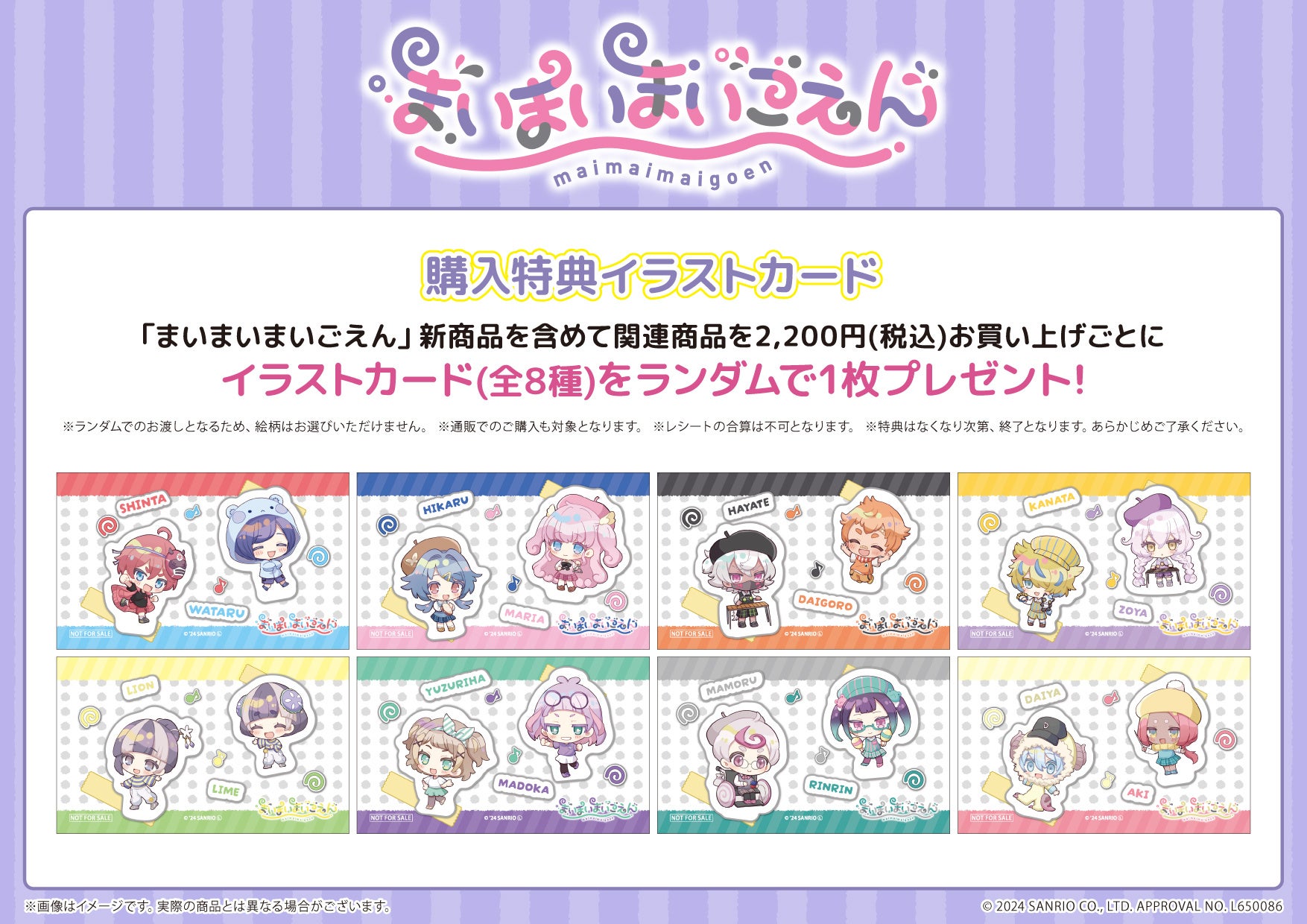 今回発売した『まいまいまいごえん』の新グッズを含む関連商品を、2,200円(税込)お買い上げごとにポストカード(全8種)をランダムで1枚プレゼントします!