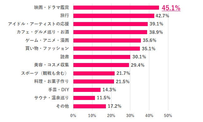 どんな趣味があるか聞いたところ、1位「映画・ドラマ鑑賞」45.1%、2位「旅行」42.7%、「アイドル・アーティストの応援」39.1%、3位「カフェ・グルメ巡り・お酒」38.9%でした。