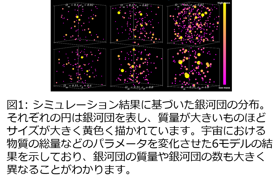 物質の総量を推定する手法として宇宙マイクロ波背景放射の他にも、バリオン音響振動、Ia型超新星、重力レンズなどが用いられてきました。本研究で採用した銀河団の質量と銀河団の数の関係を用いる手法は、これらの手法とは完全に異なり、物質の総量などの宇宙論パラメータを制約するための競争力のある手法であると実証したことは大変意義があります。加えて、すばる望遠鏡、暗黒エネルギーサーベイ、暗黒エネルギー分光器、ユークリッド望遠鏡、eROSITA望遠鏡、ジェイムズ・ウェッブ宇宙望遠鏡のような、広視野・深視野の大規模な撮像・分光銀河サーベイから利用可能になりつつある新しい観測データに対しても応用可能であり、今後の発展が大いに期待できます。