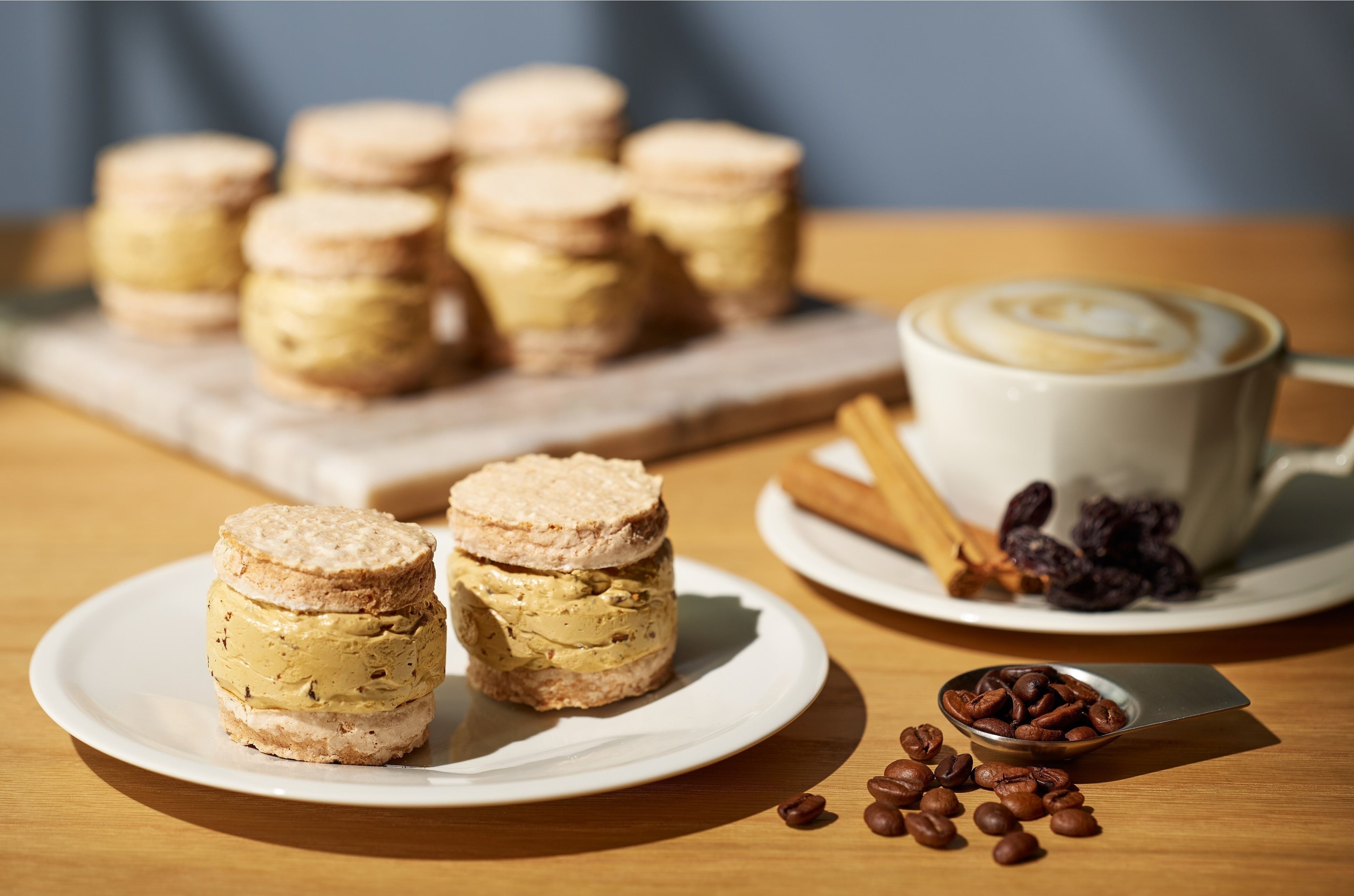 ラムレーズンを練り込んだカフェラテ風味の発酵バタークリームを、ほんのりとシナモンが香るサクサクなダックワーズ生地でサンドしました。華やかなカフェラテの薫りのなかに、ラムレーズンとシナモンのアクセントが楽しめる、とても濃厚で贅沢なお味の逸品です。