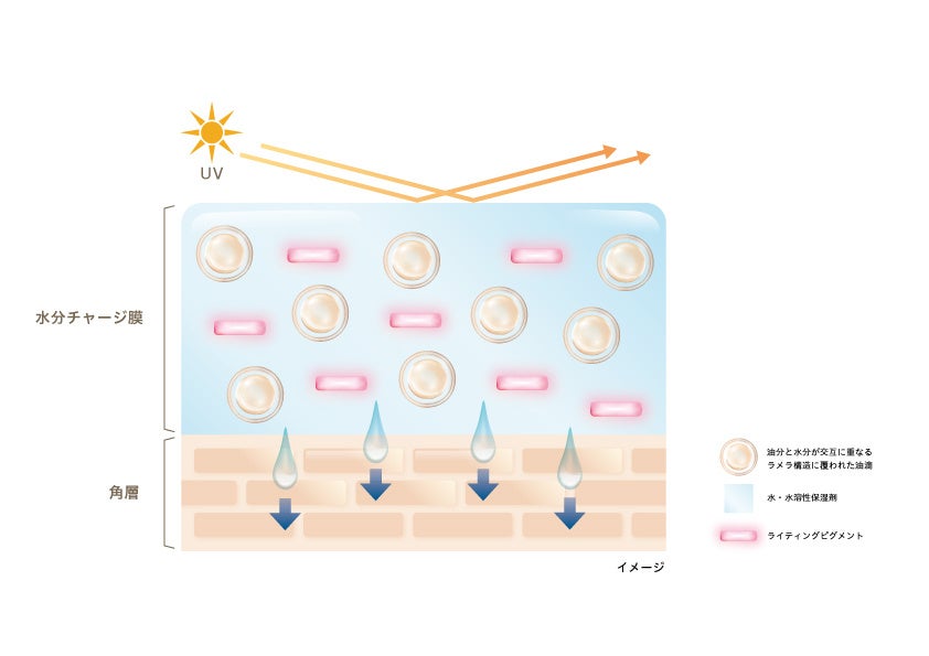 独自開発のラメラ乳化技術による水分チャージ膜を肌の上に形成