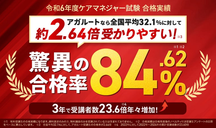 株式会社アガルート(本社:東京都新宿区、代表取締役:岩崎 北斗、以下「アガルート」)が運営する「アガルートアカデミー」は、2025年合格目標の介護支援専門員(ケアマネジャー)試験合格カリキュラム/合格総合講義をリリースいたしました。