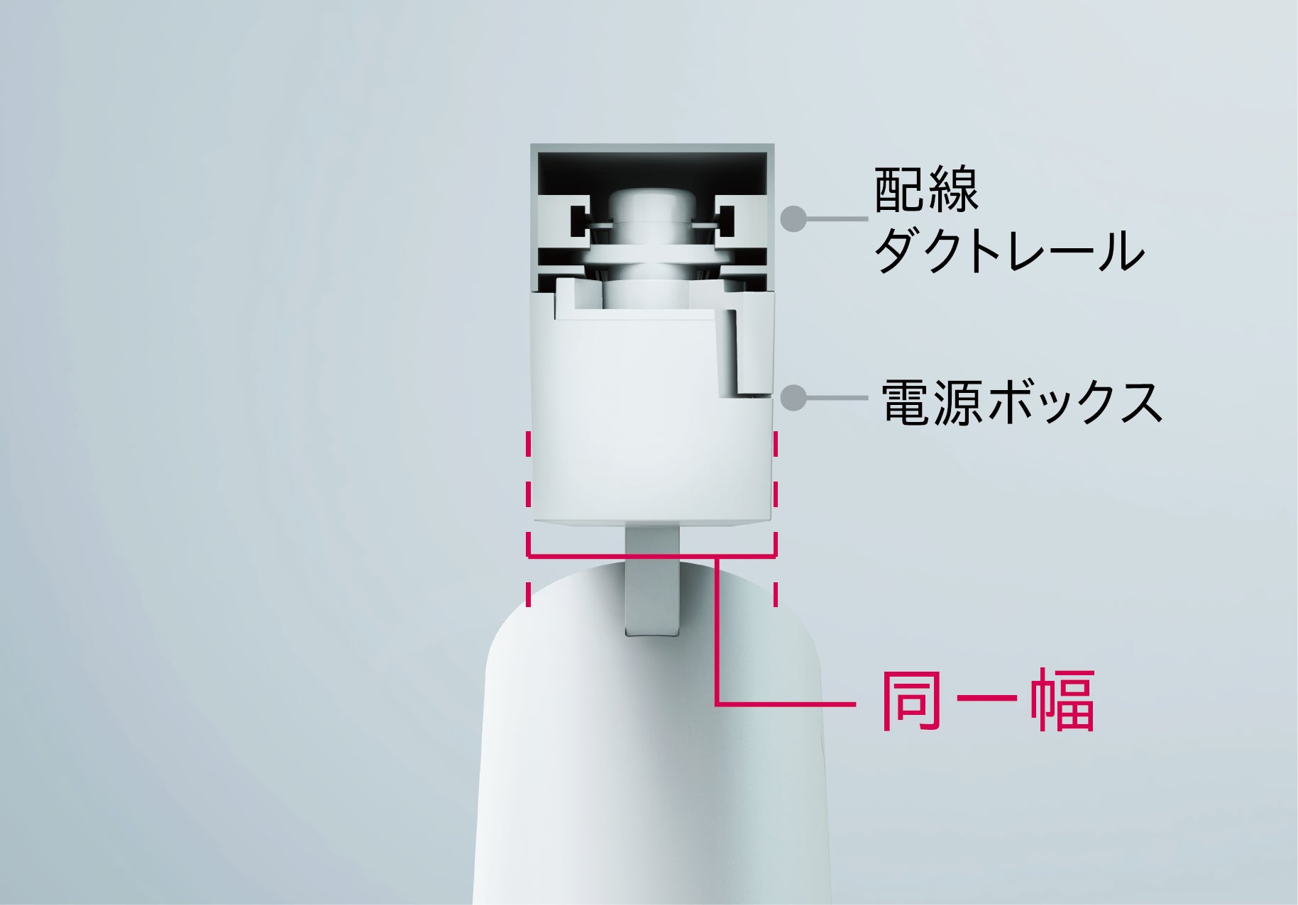 白色と黒色から選べる筒型のスリムな筐体と電源ボックスを、配線ダクトレールと同じ幅で設計しているため、本体に統一感があり天井を含めた施設空間をスマートに演出します。