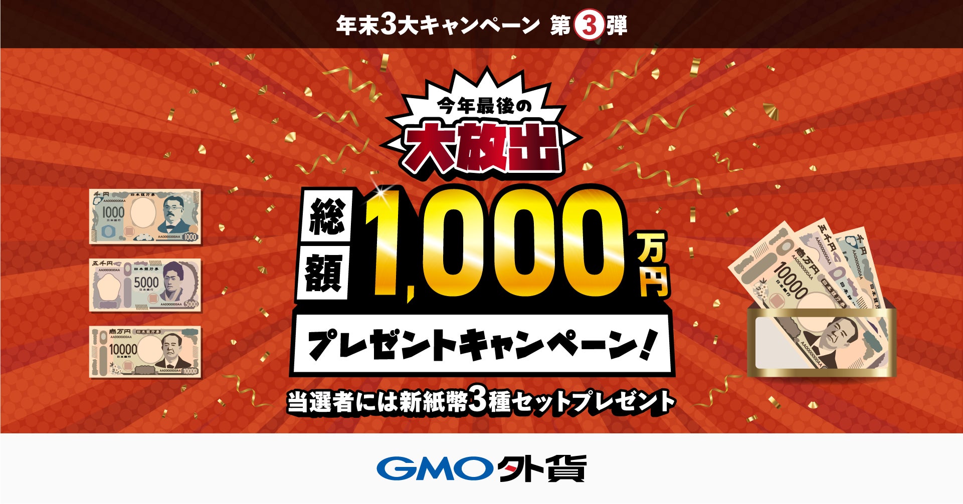 GMOインターネットグループのGMOフィナンシャルホールディングス株式会社の連結会社で、金融商品取引業を営むGMO外貨株式会社(本社:東京都渋谷区、代表取締役社長:小西 洋平、以下「当社」)は、2024年12月2日(月)より、当社が提供するFX取引サービス「外貨ex」において「年末3大キャンペーン」第3弾として「今年最後の大放出総額1,000万円プレゼントキャンペーン!」を実施いたします。