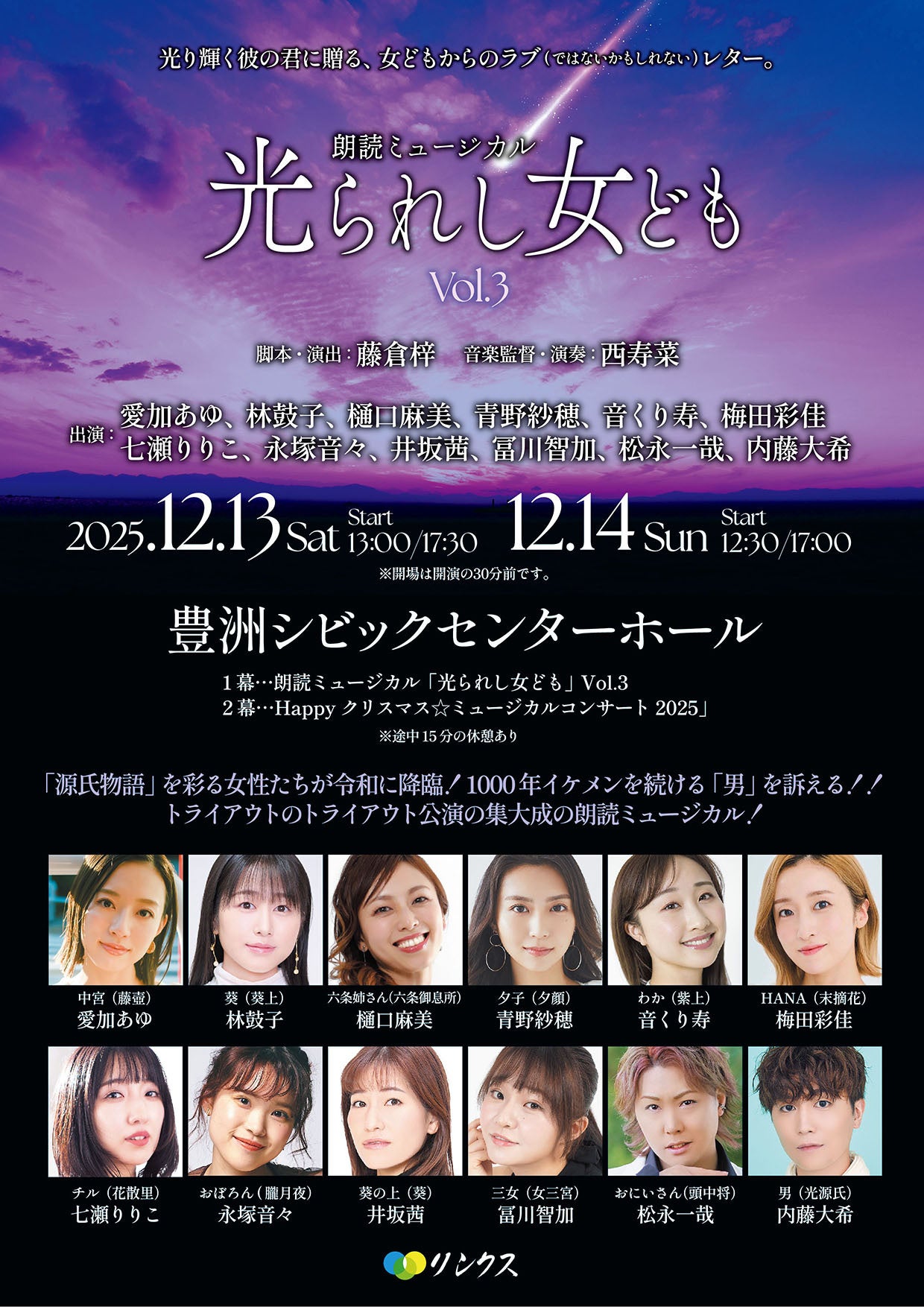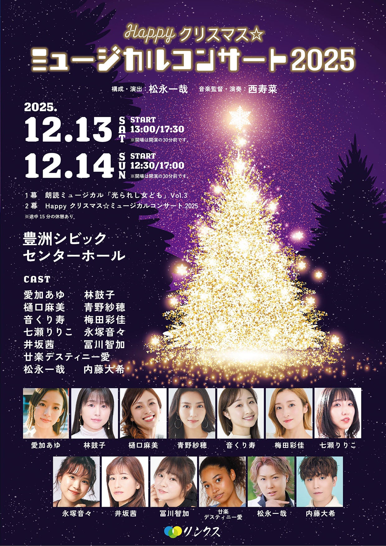 2025年12月13日(土)~14日(日)に豊洲シビックセンターホールにて、朗読ミュージカル「光られし女ども」&「Happyクリスマス☆ミュージカルコンサート」を上演します。