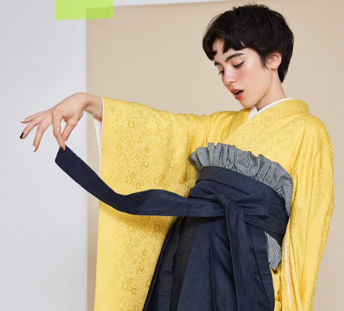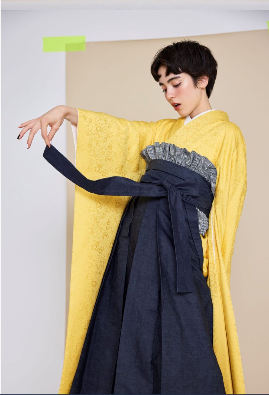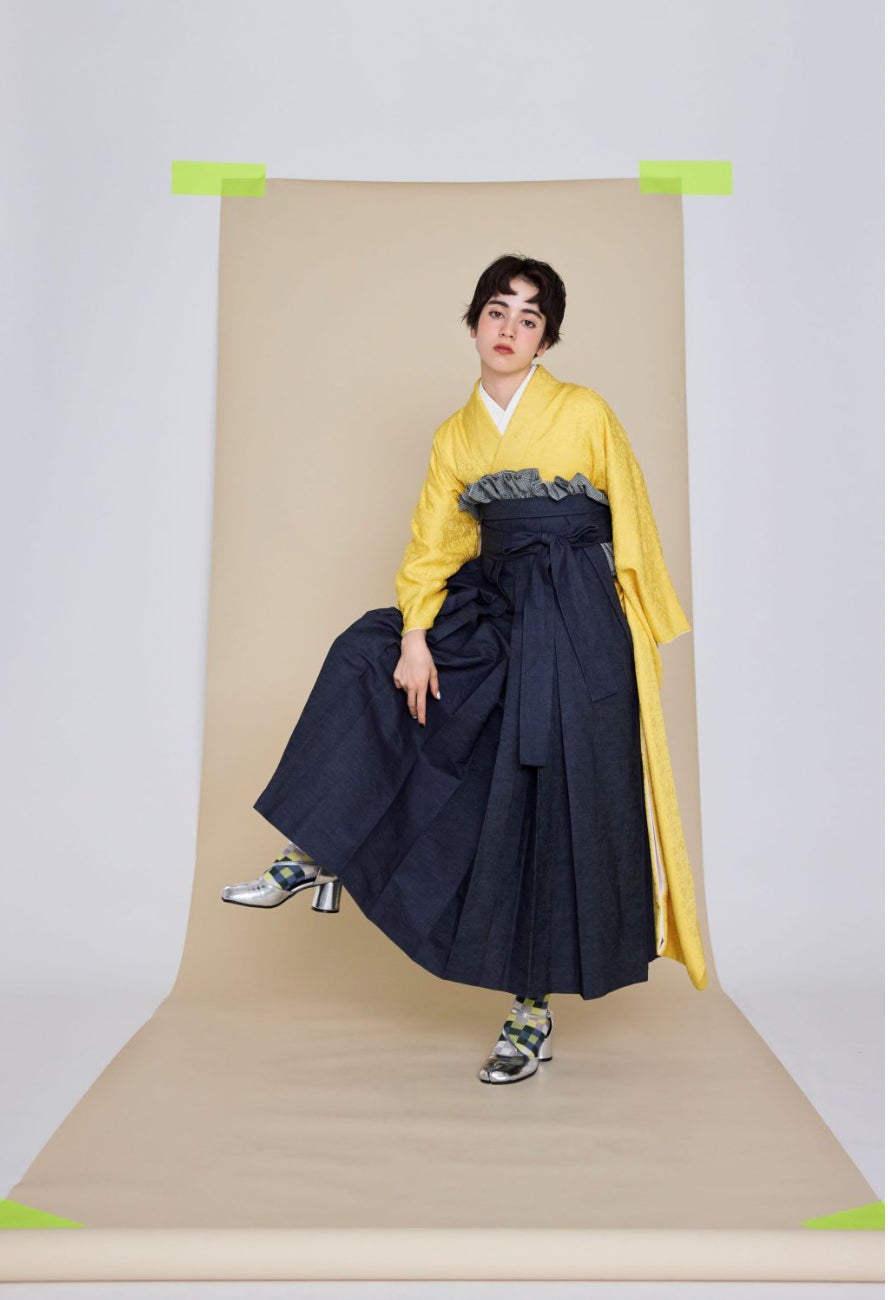 色鮮やかでシンプルな黄蓮と生地に特徴のあるデニム袴を合わせることで、他にはないファッショナブル且つカジュアルなスタイリングが完成。