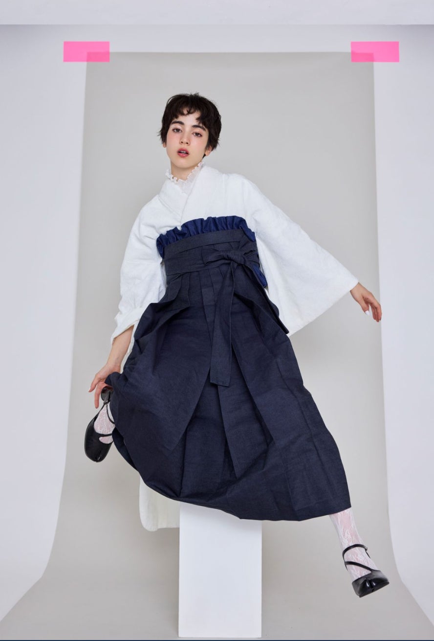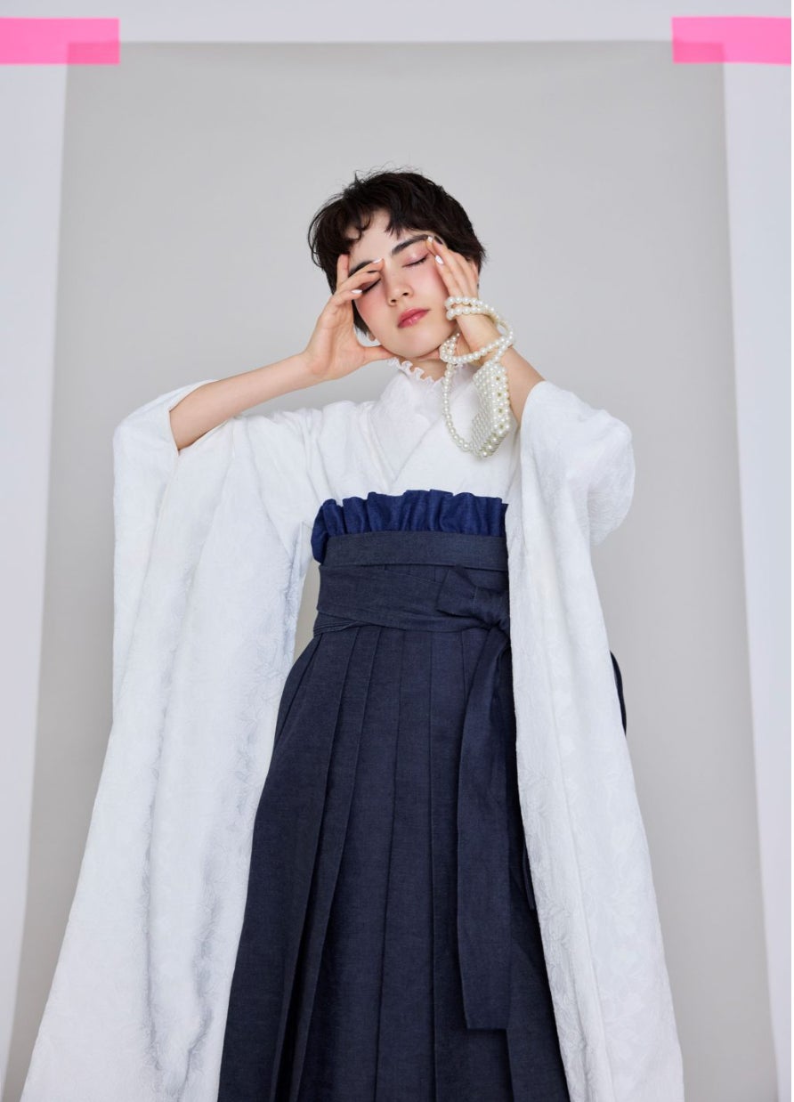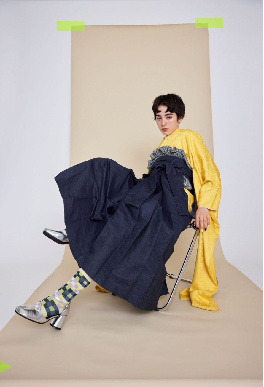 色鮮やかでシンプルな黄蓮と生地に特徴のあるデニム袴を合わせることで、他にはないファッショナブル且つカジュアルなスタイリングが完成。