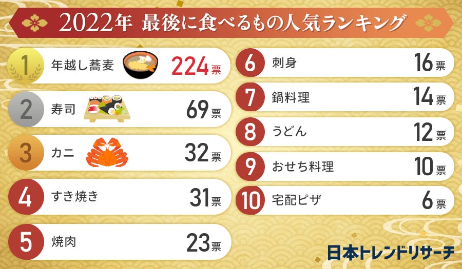 今回行ったアンケートでは、定番の「年越しそば」が首位に輝き、寿司、カニの順でランクインしました。