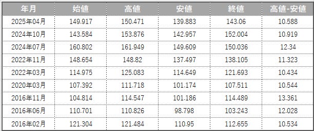 表2.2015年以降で、USD/JPY(米ドル/円)の値幅が10円以上だった月(単位:円、レートは外為どっとコム「外貨ネクストネオ」を参照)-右