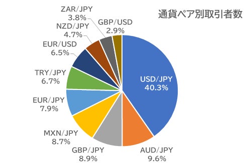通貨ペア別取引者数のトップ10は、USD/JPY(米ドル/円)・AUD/JPY(豪ドル/円)・GBP/JPY(ポンド/円)・MXN/JPY(メキシコペソ/円)・EUR/JPY(ユーロ/円)・TRY/JPY(トルコリラ/円)・EUR/USD(ユーロ/米ドル)・NZD/JPY(NZドル/円)・ZAR/JPY (南アフリカランド/円)・GBP/USD(ポンド/米ドル)の順。