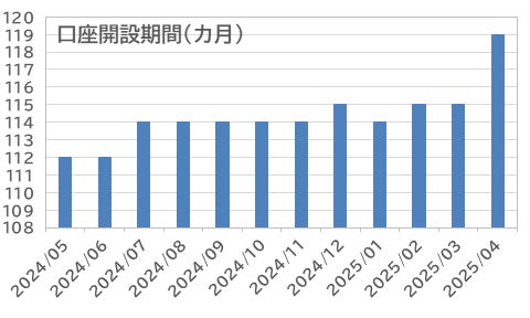 取引をしたFX投資家の口座開設後の期間は、平均119カ月(9年11カ月)と、前月から拡大。口座開設期間は長期化が進んでいる。