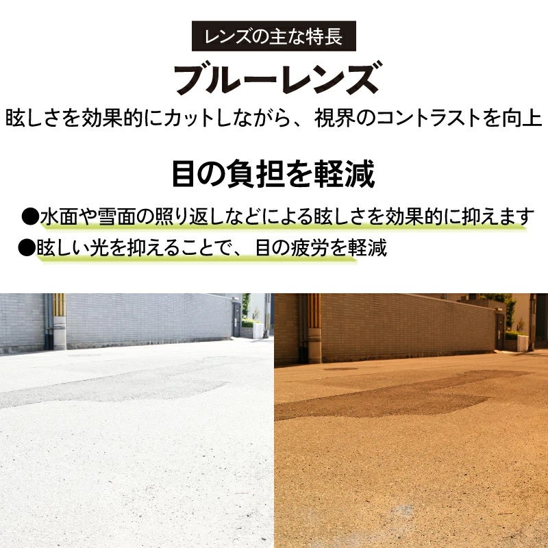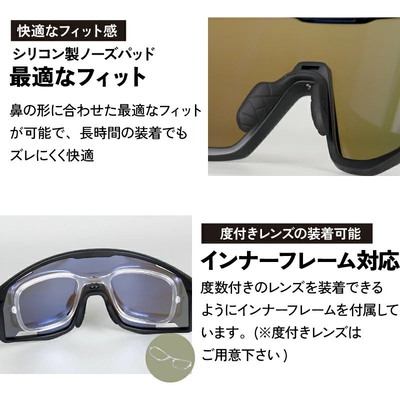 TAC偏光レンズ/可視光透過率(VLT):8-18%/取り外し可能:可能/インナーフレーム装着:可能(度付きレンズ対応)/レンズコーティング:あり(100%コーティング)
