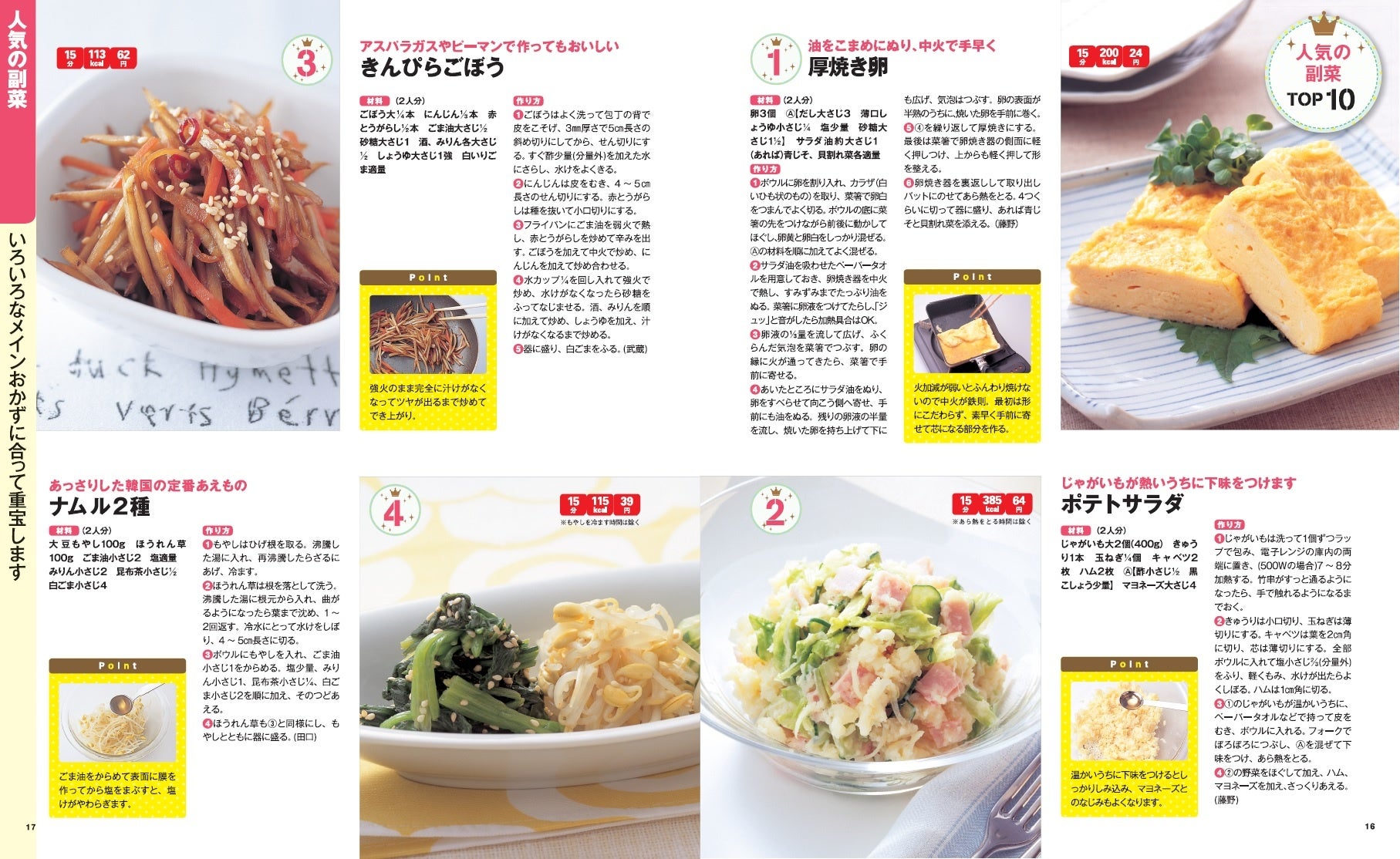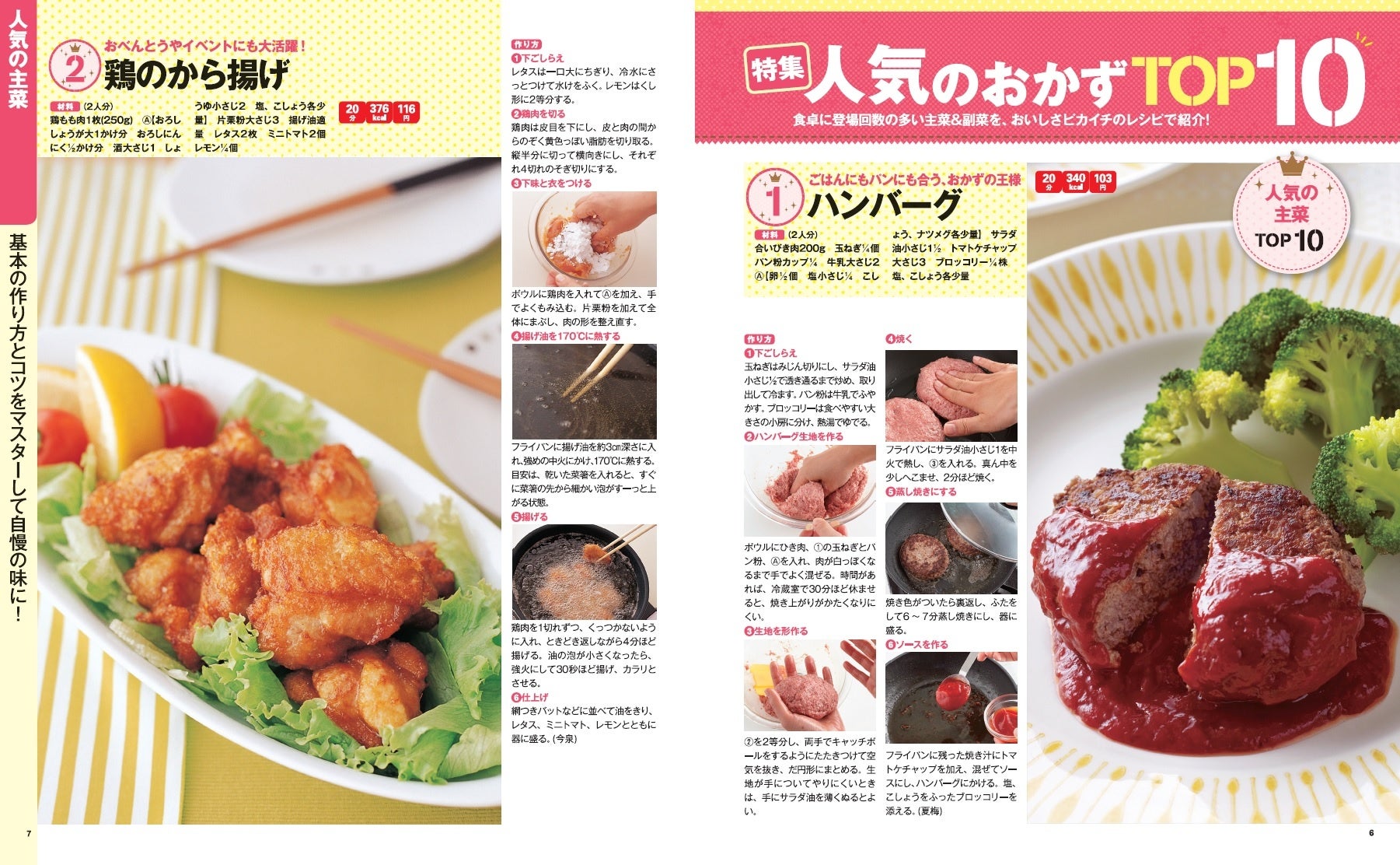 巻頭では定番かつ人気の主菜・副菜をそれぞれ10品紹介しています。主菜のレシピは工程写真が付いているので、手順が分かりやすいのがポイント。定番レシピの本当においしい作り方が分かります。主菜はハンバーグやから揚げ、グラタンなどの子どもも喜ぶレシピを中心に紹介。副菜は卵焼きやポテトサラダ、きんぴらごぼうなどお弁当のおかずにもおすすめのレシピを掲載しています。