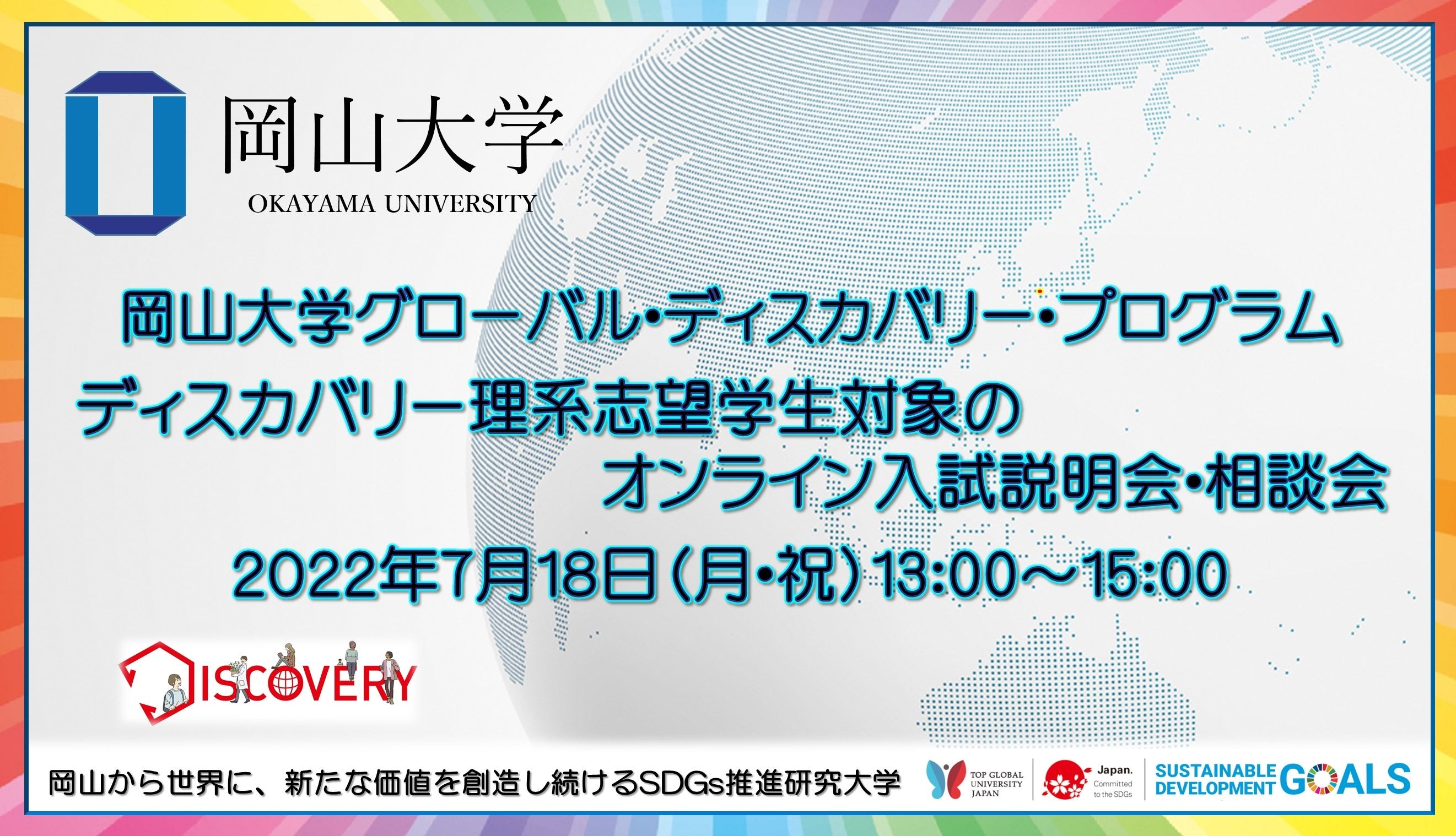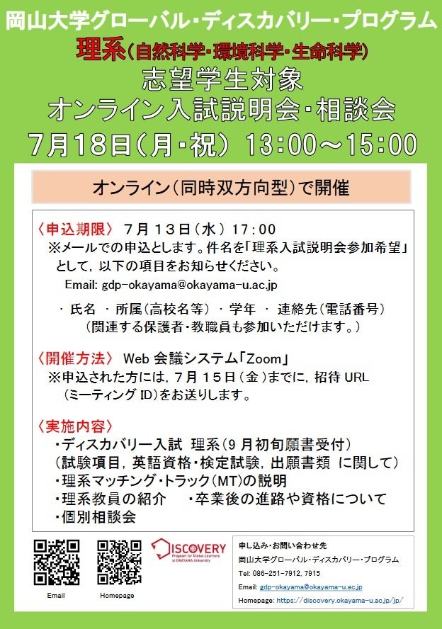 【岡山大学】岡山大学グローバル・ディスカバリー・プログラム「ディスカバリー理系志望学生対象のオンライン入試説明会・相談会」〔7/18, 月・祝〕