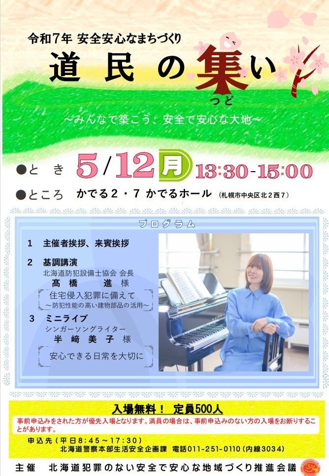 集いでは、北海道防犯設備士協会会長の 髙橋 進 氏を講師とした住宅侵入犯罪防止に関する基調講演や、シンガーソングライターの 半﨑 美子 氏によるミニライブを行います!